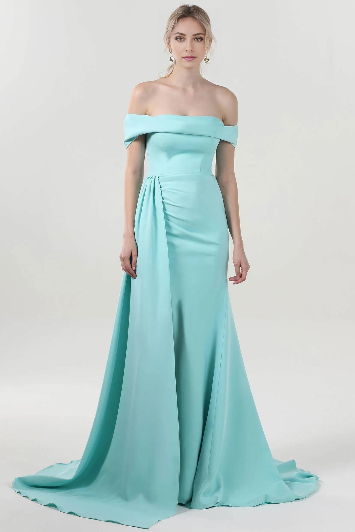 Elegant Tiffany Blue Sheath-Column Off-the-Shoulder Sleeveless Back Zip Floor-Length Slit Prom Dress with Draped Detail - US 2 / UK 6 / EU 32