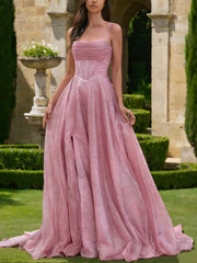 Glamorous A-Line Sweetheart Spaghetti Strap Lace-Up Back High Slit Tulle Pleated Sequins Floor Length Prom Dresses