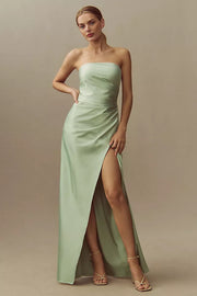 sjzca's fresh and elegant ball gown is crafted from mint green satin. The strapless and sleeveless design combines elegance and sexiness, while the side ruching adds layers and a slimming effect. The high slit enhances its dynamism, and the flowing skirt has a natural shimmer. It is suitable for formal occasions such as balls and banquets, making it the first choice for women who pursue a fresh and elegant style.