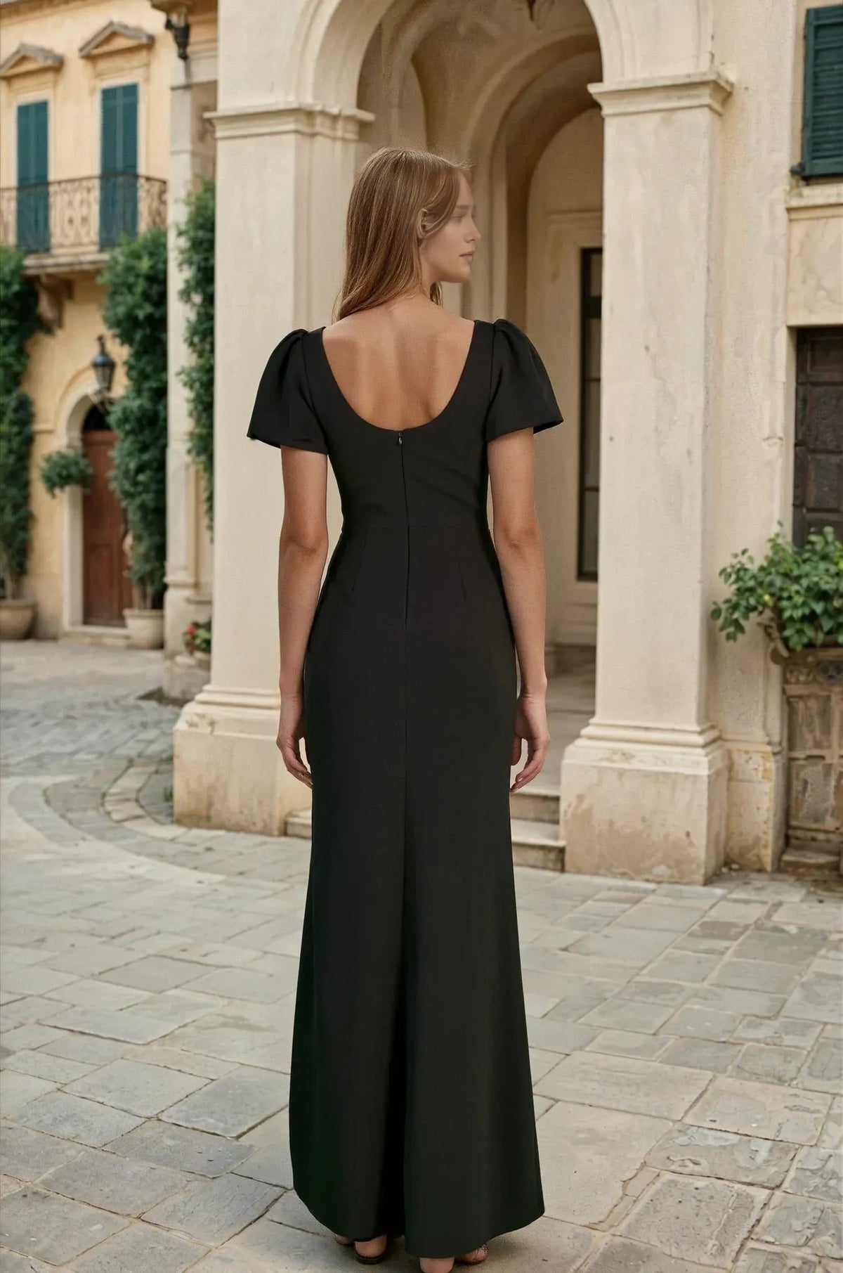 Romantic Black Sheath Square Neck Puff Sleeve Back Zip Floor-Length High Slit Ruched Prom Dress