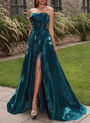 Sparkle & Shine Ink Blue A-Line Strapless Sleeveless Back Zip Sweep Train Ruched High Slit Satin Prom Dress - US 2 / UK 6 / EU 32