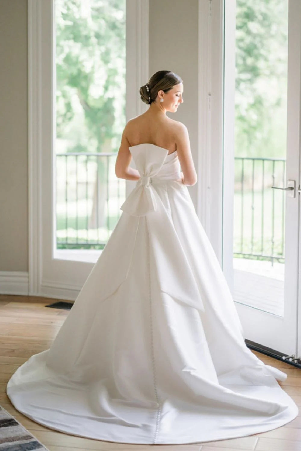 Elegant A Line Strapless White Satin Long Bridal Dress with Bowknot