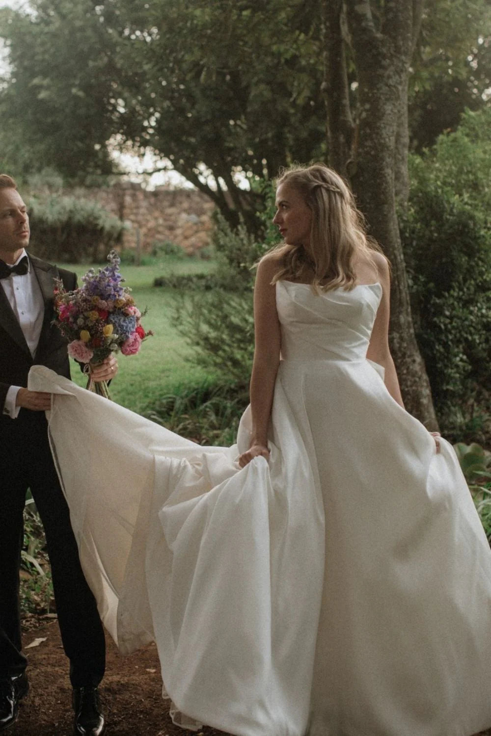 Elegant A Line Strapless White Satin Long Wedding Dress with Ruched