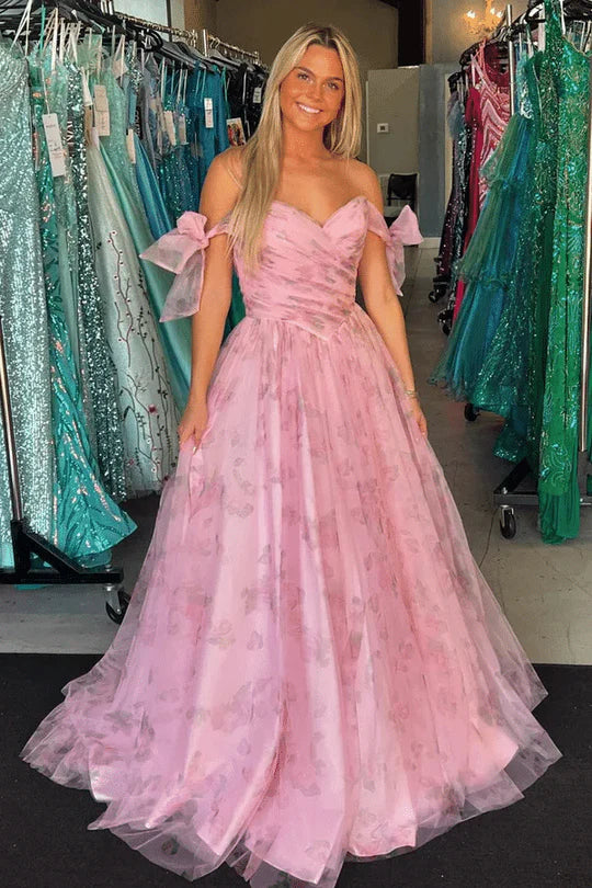 A-Line Pink Printing Off-Shoulder Tulle Long Prom Formal Dress