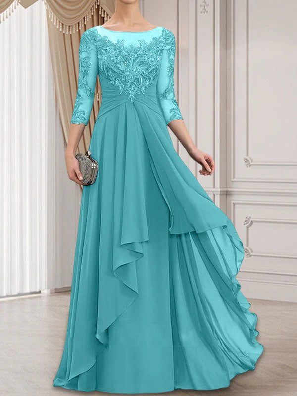 A-line Scoop Illusion Floor-Length Lace Chiffon Mother of the Bride Dress With Cascading Ruffles