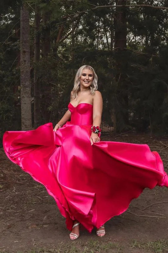 A-Line Strapless Empire-Waist Sleeveless Satin Long Prom Formal Dress with Slit