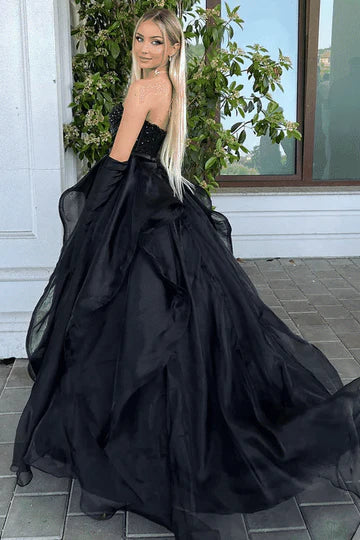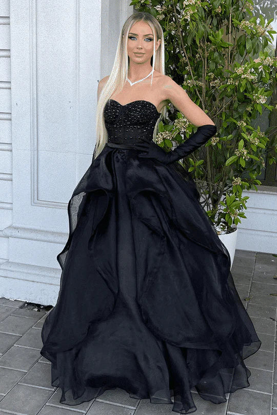 A-Line Strapless Sweetheart Ruched Black Long Prom Formal Dress