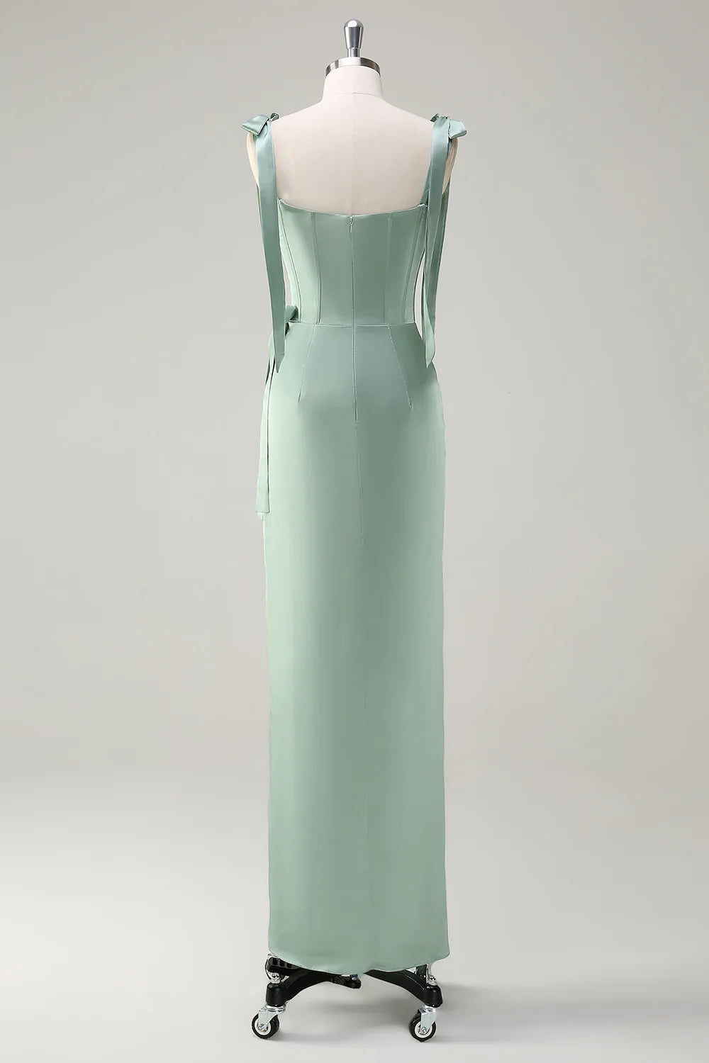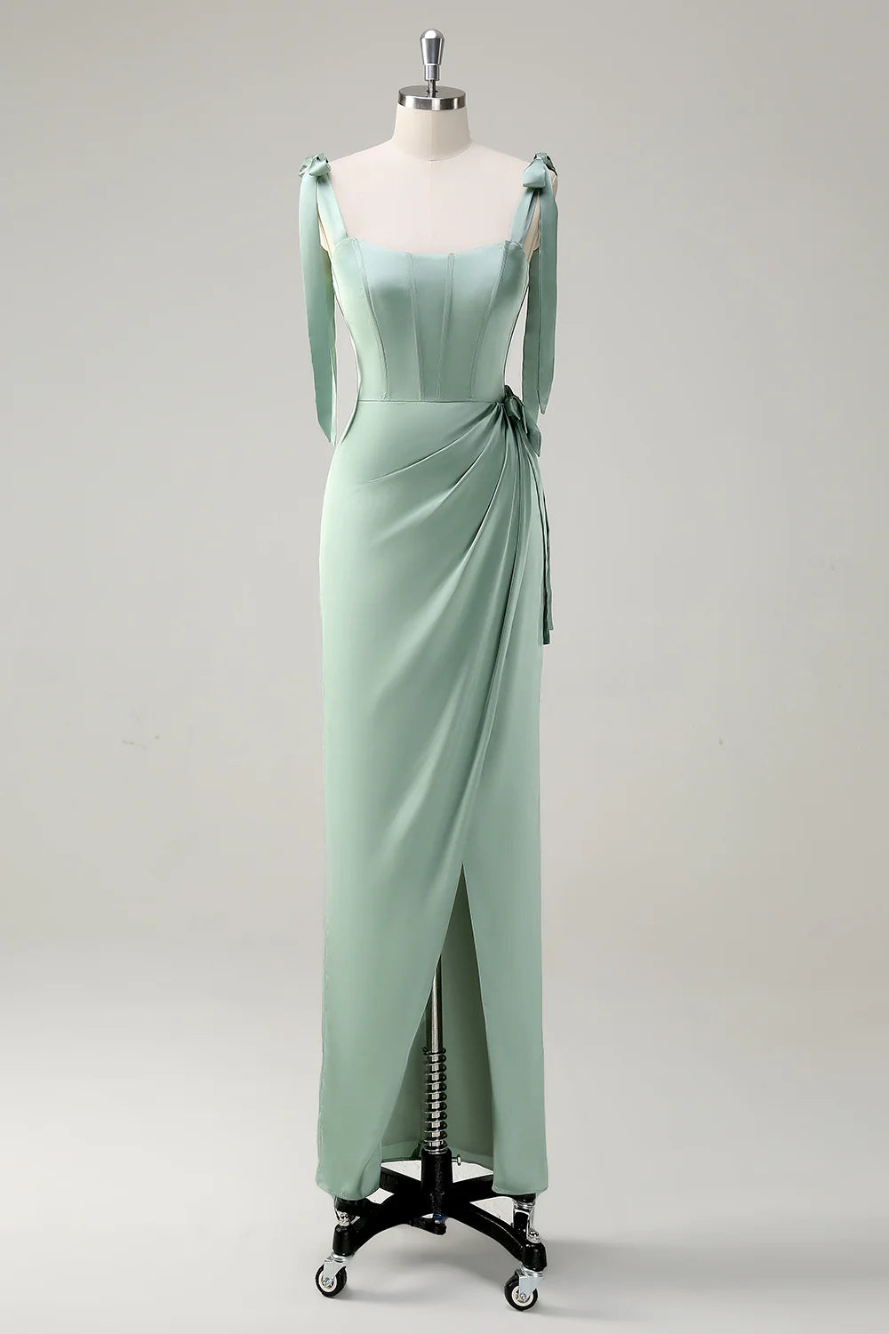 Agave Sheath Bow Straps Ruched Corset Long Bridesmaid Dress with Slit