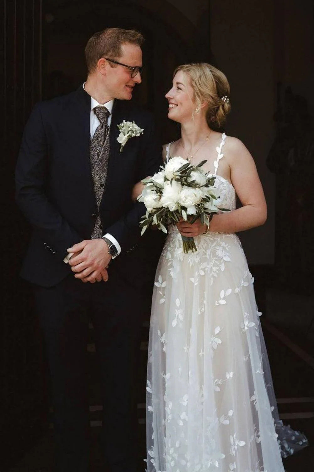 Beautiful A Line Spaghetti Straps White Tulle Wedding Dress with Appliques