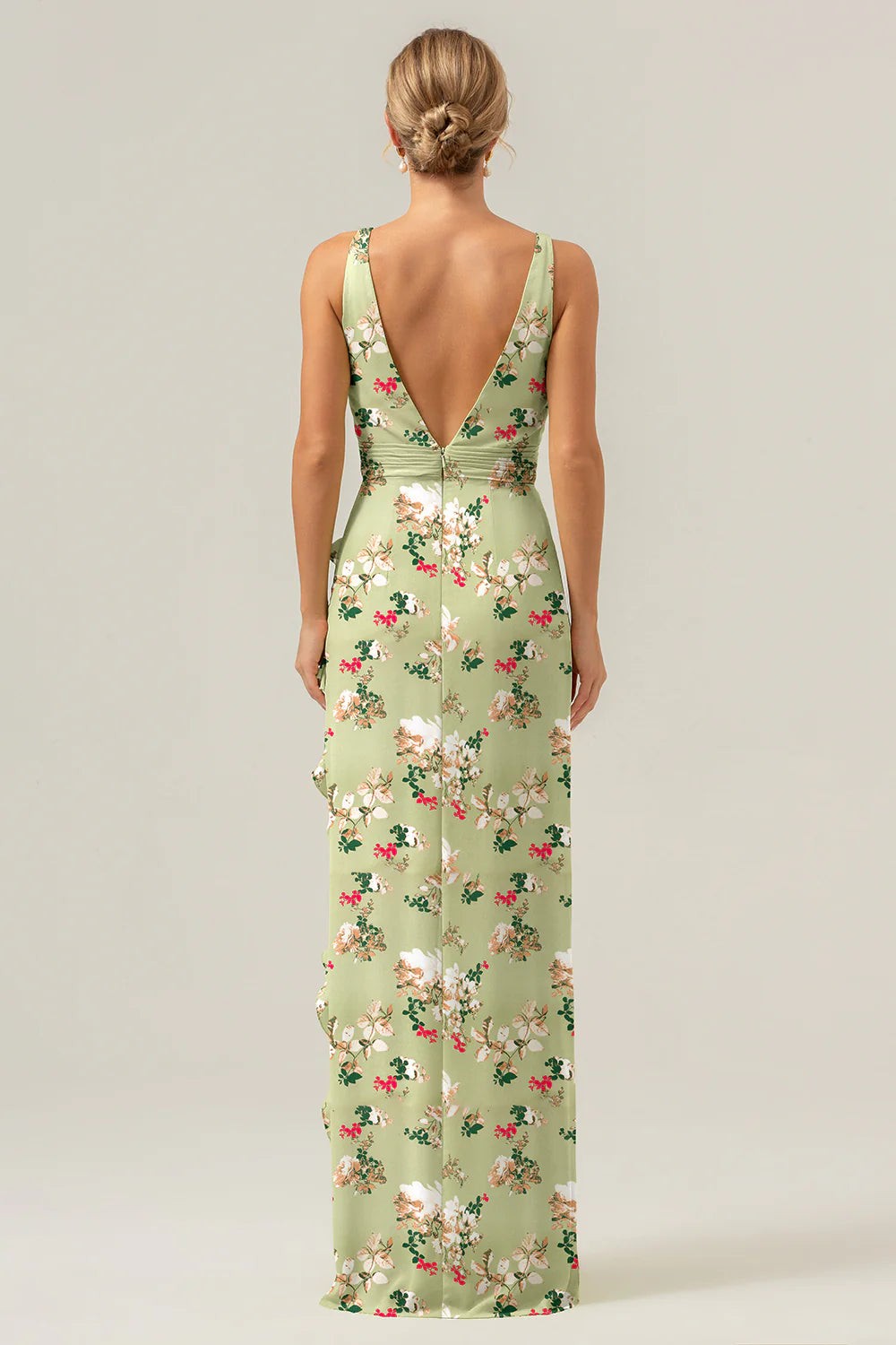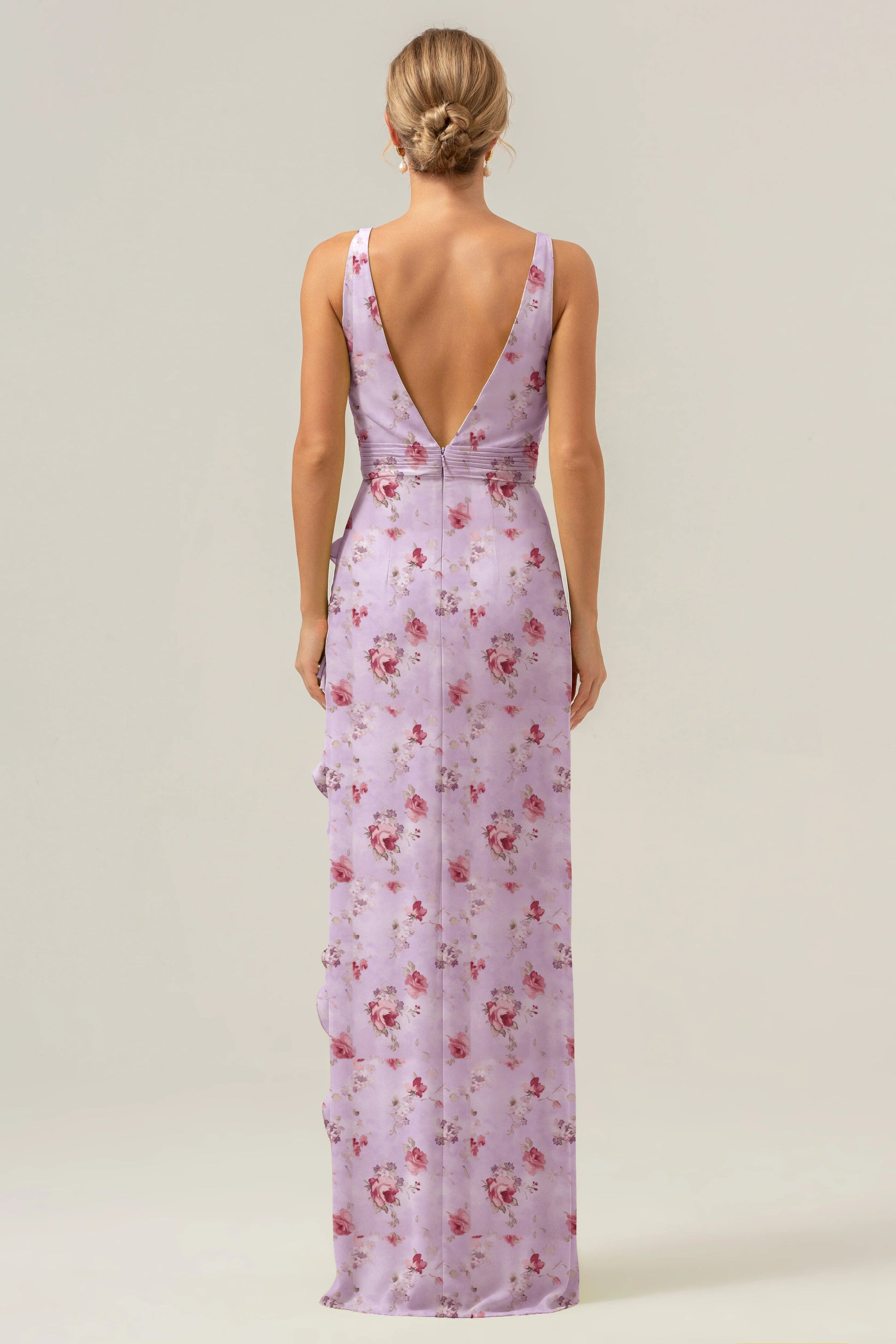 Big floral sheath V-neck backless bridesmaid dress with ruffles