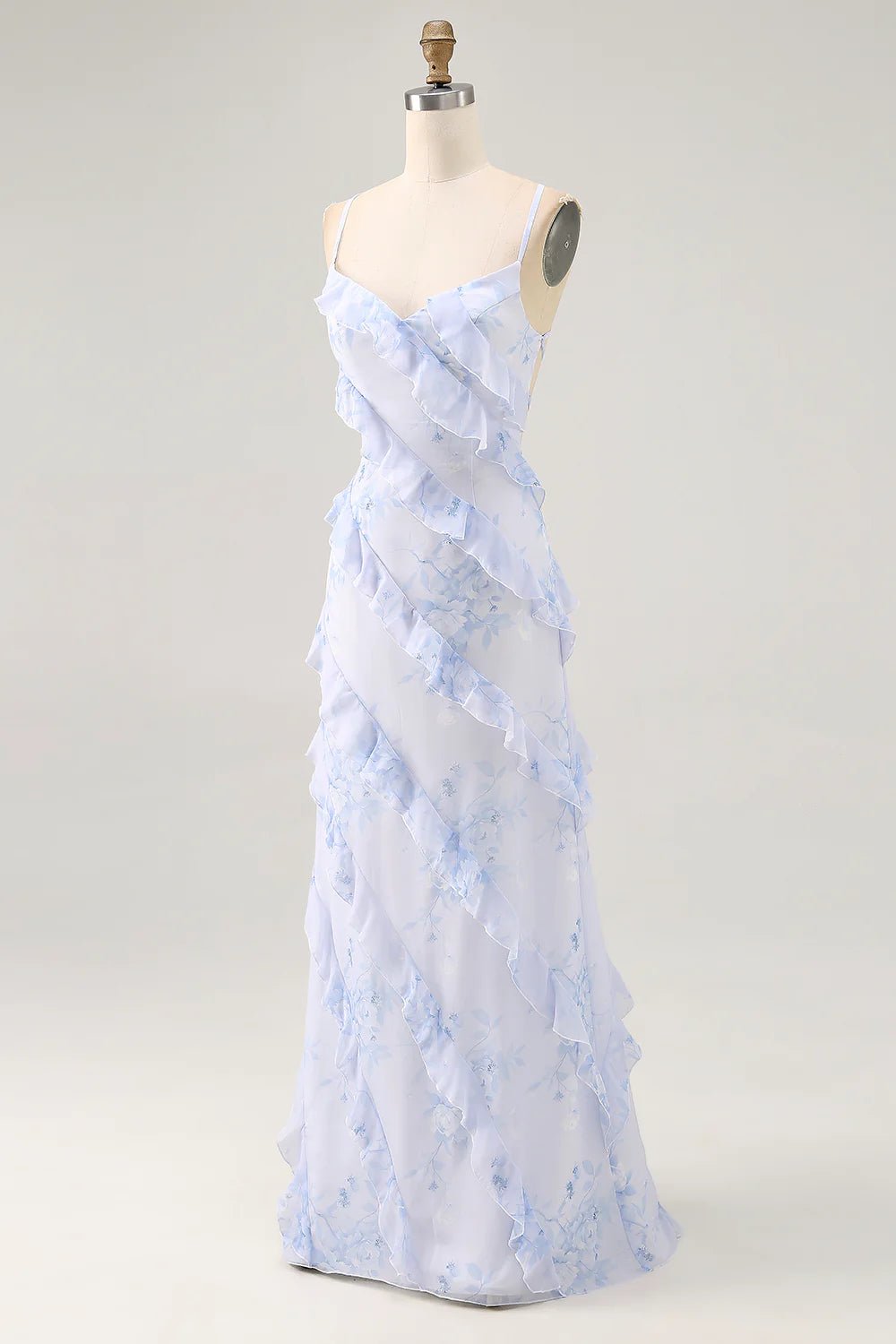 Blue Flower Sheath Printed Long Bridesmaid Dress with Lace Up Back