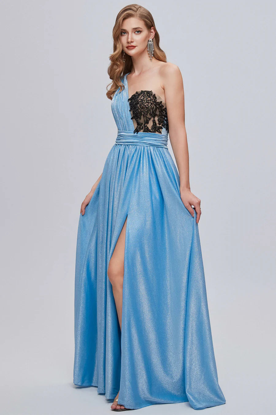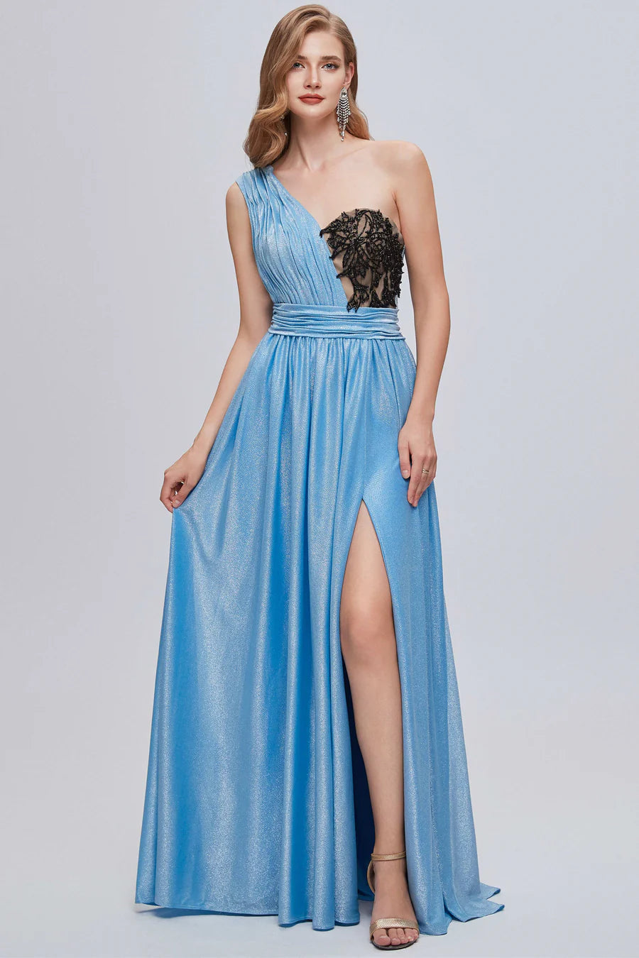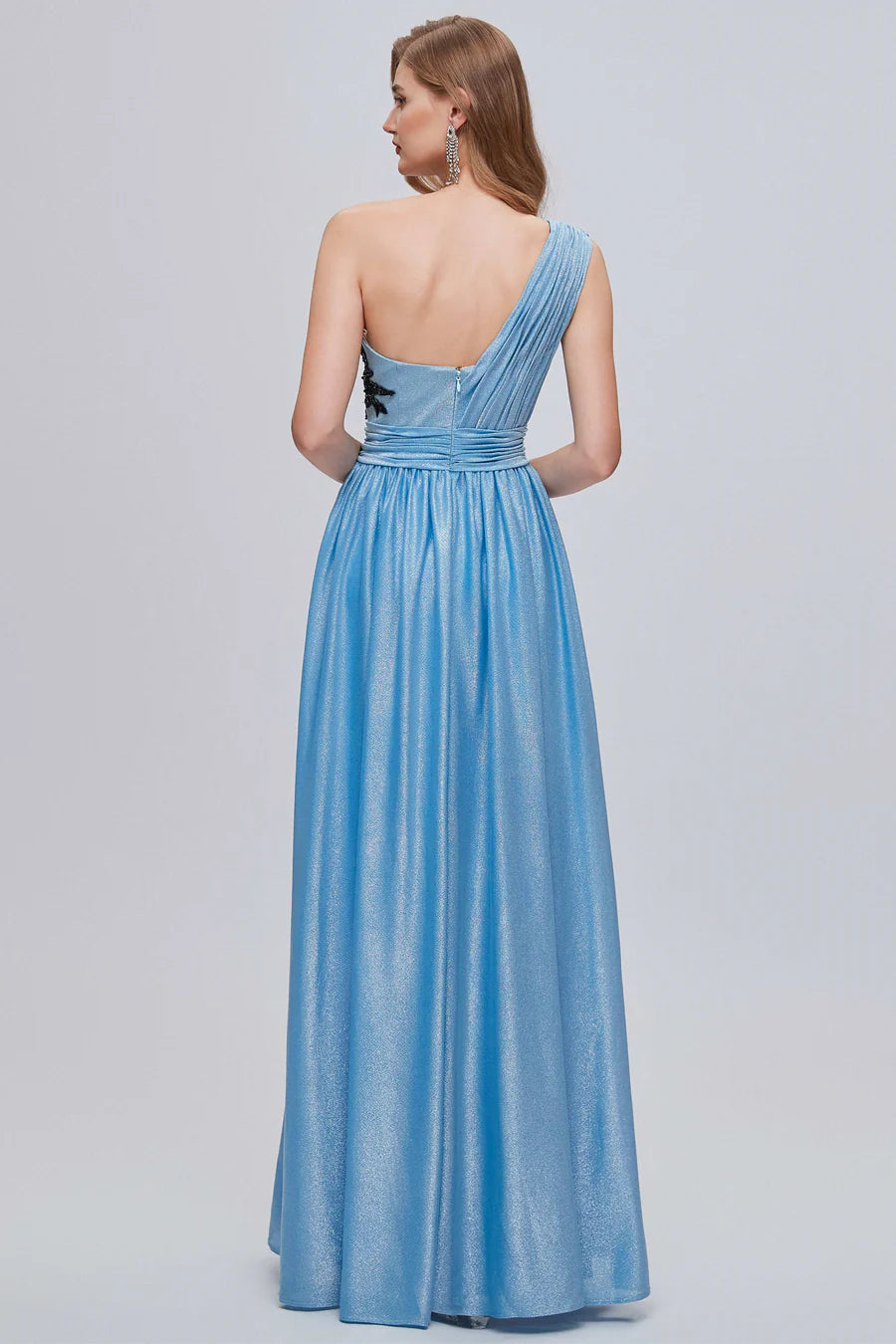Blue One-Shoulder Bustier A-Line Long Prom Gown