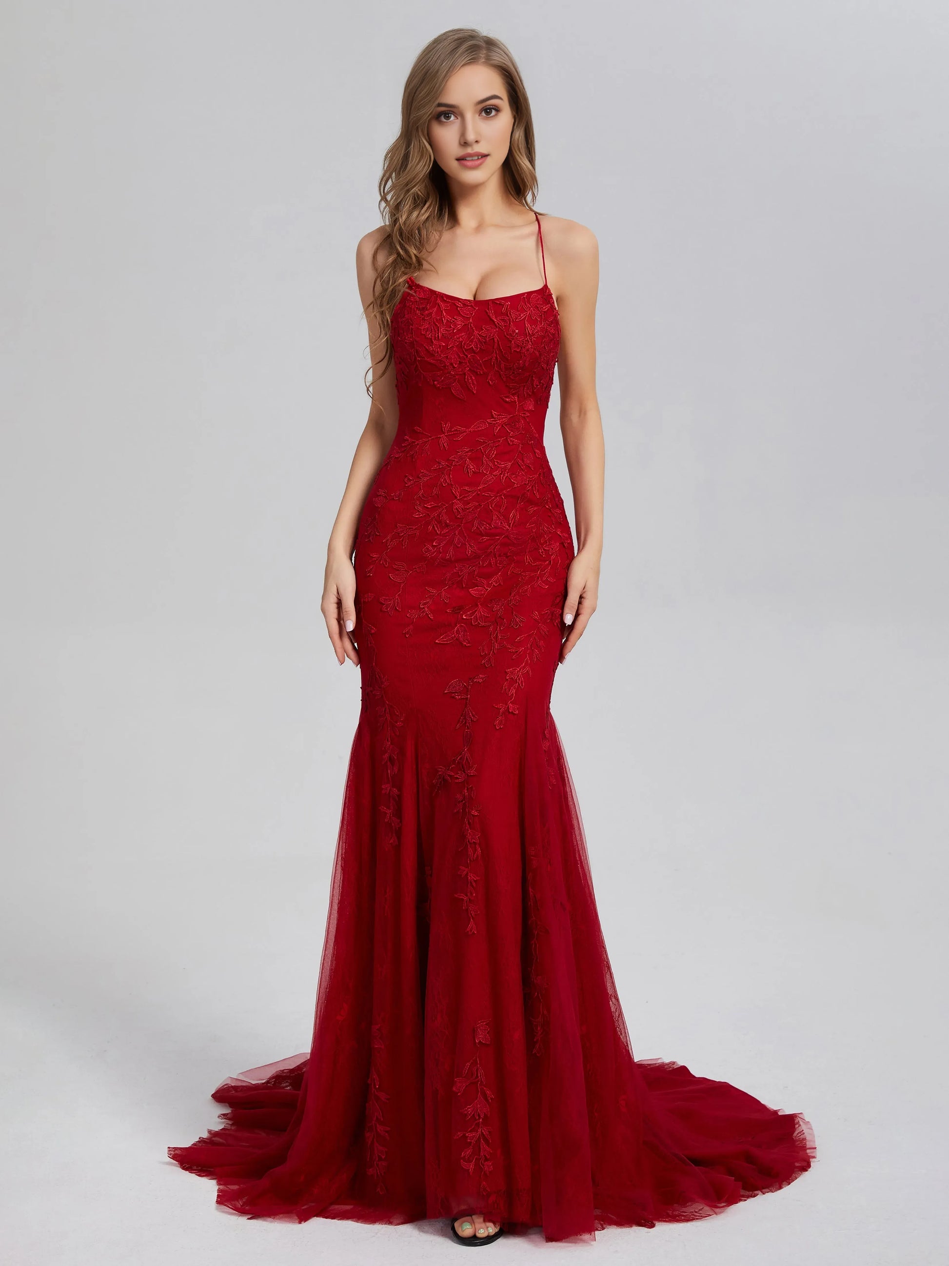 Burgundy Lace Mermaid Appliques Lace Prom Dress with Spaghetti Straps and Tulle Train
