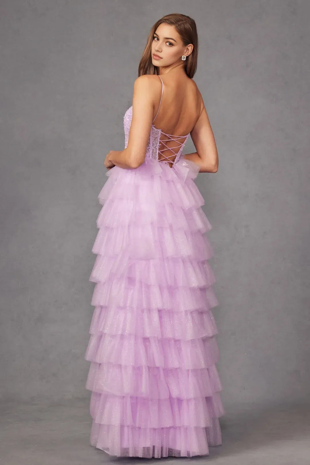 This elegant A-line prom dress features a sweetheart neckline adorned with delicate appliques and shimmering sequins, creating a sophisticated and glamorous look. The sleeveless design and lace-up back ensure a comfortable, tailored fit, while the floor-length skirt with tiered ruffles and a side leg slit adds movement and a touch of daring style. Perfect for formal occasions, this dress combines classic charm with modern details to make a memorable impression.