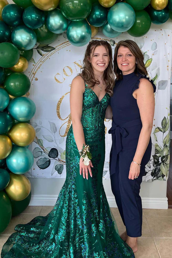 Deep V-thin suspender waist cinching sequin embroidered long skirt with trailing edge