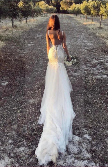 Elegant Mermaid Zipper Back Lace Tulle Long V Neck Wedding Dresses With Appliques