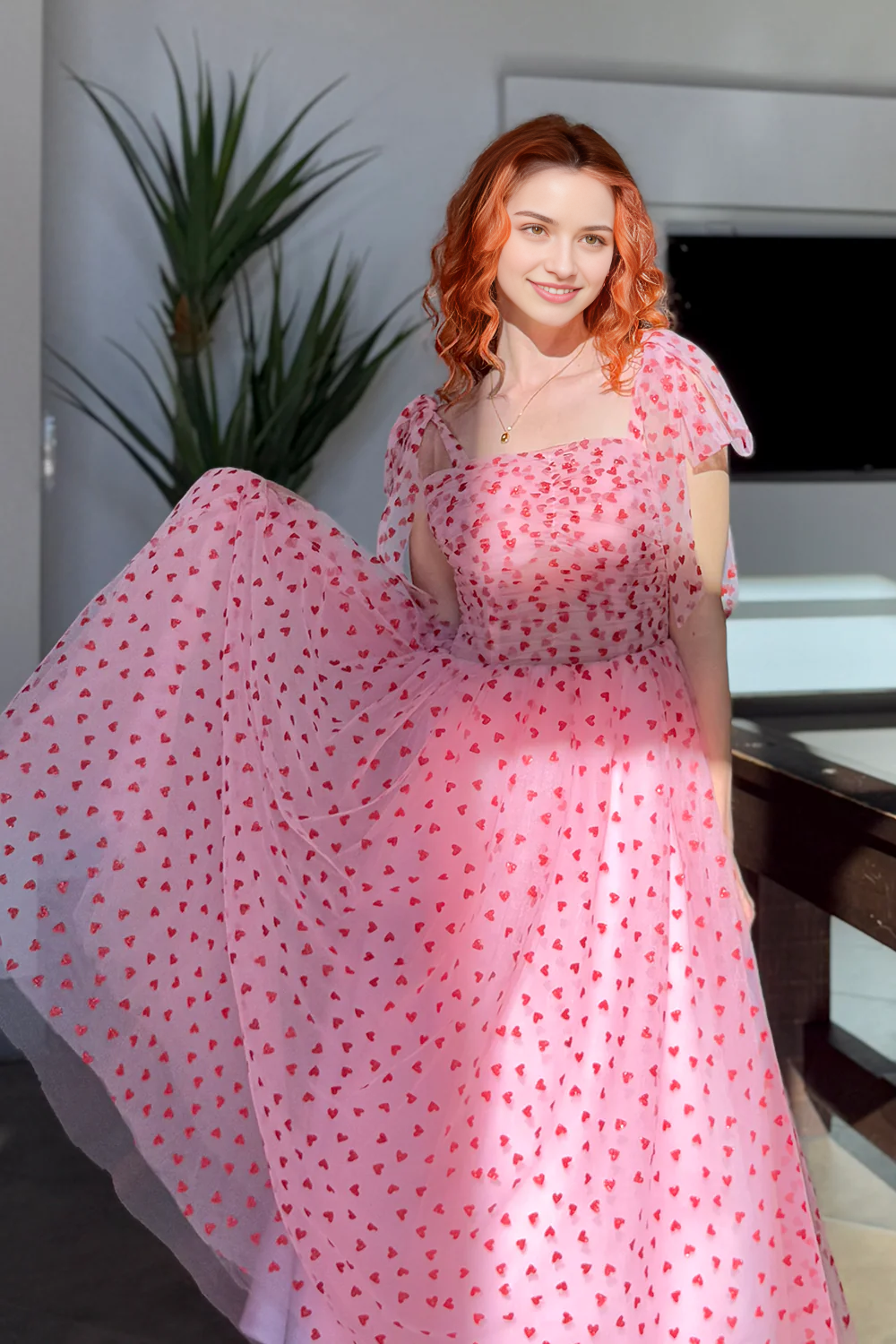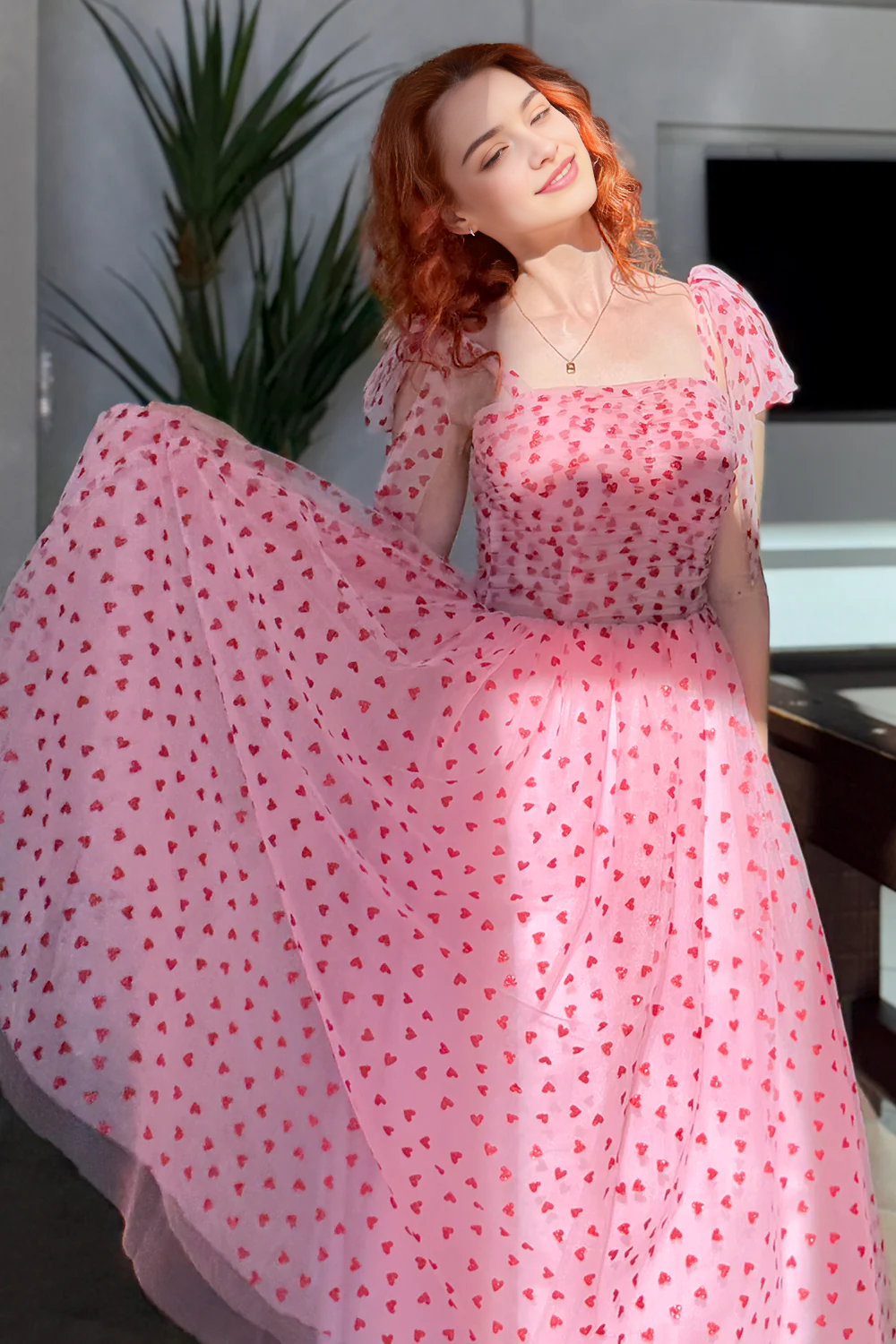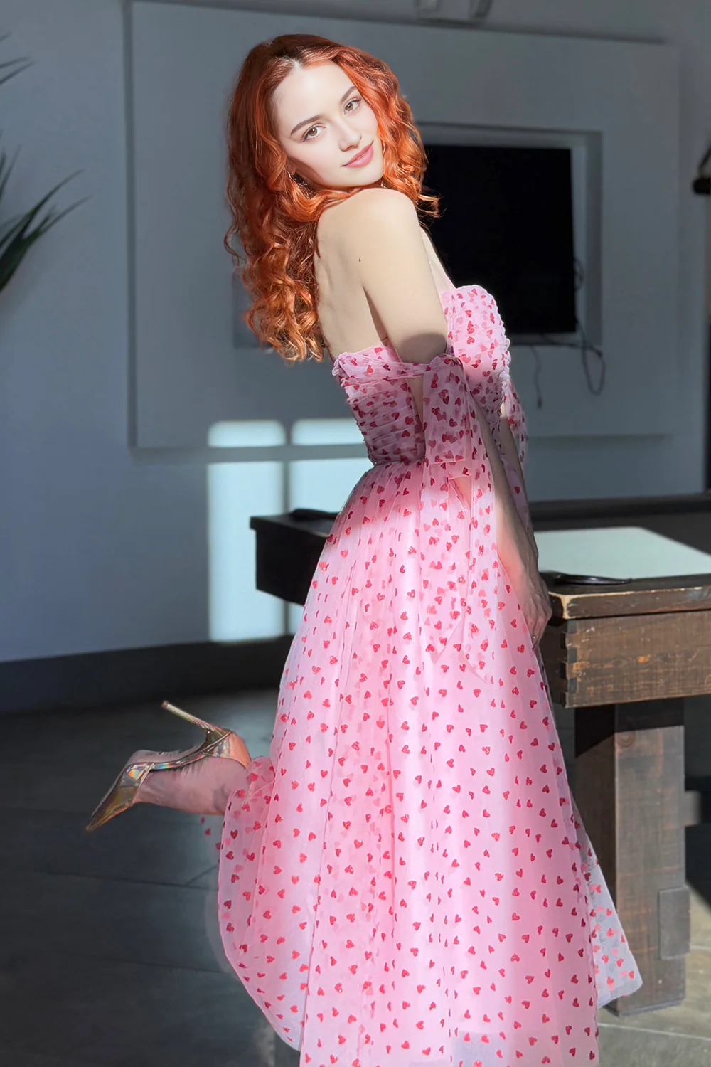 Elegant Pink A-Line Bow Straps Tulle Corset Tea-Length Prom Dress with Hearts
