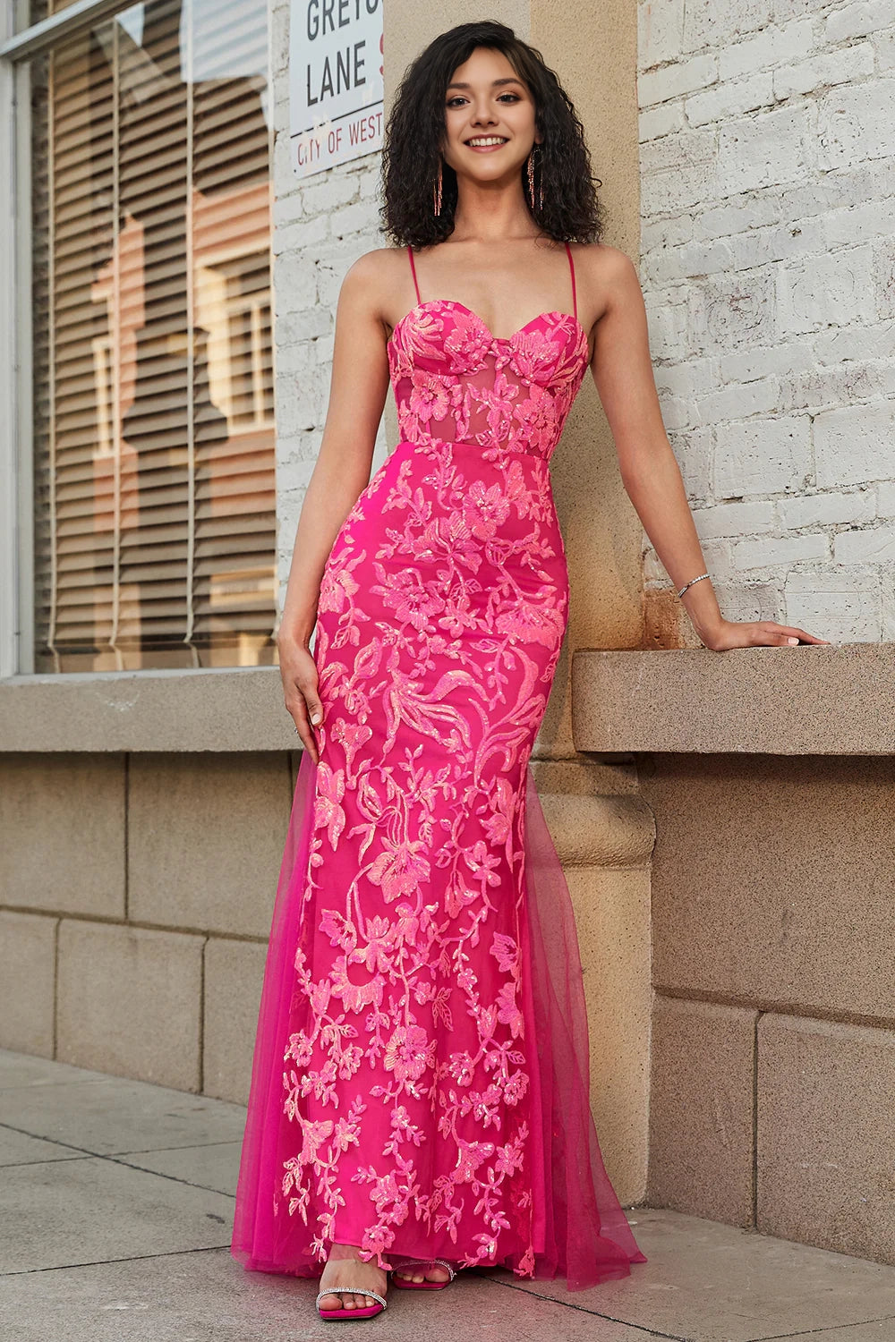 Fuchsia Mermaid Spaghetti Straps Sequins Corset Prom Dress with Appliques