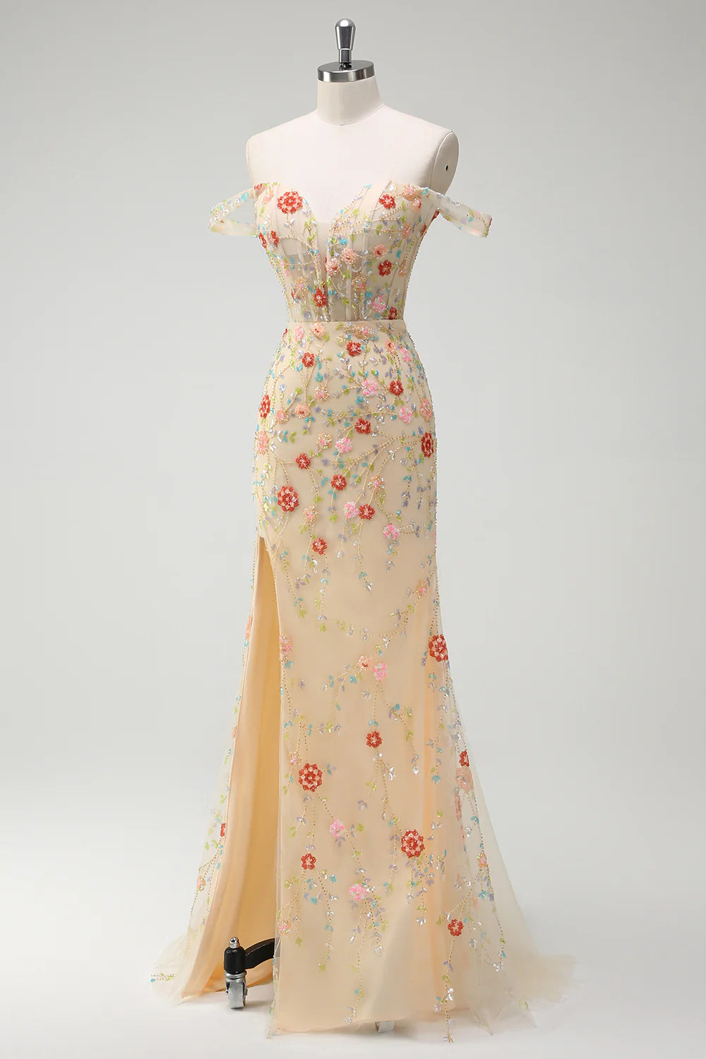 Glitter Champagne Mermaid Off the Shoulder Floral Sequin Long Prom Dress with Slit