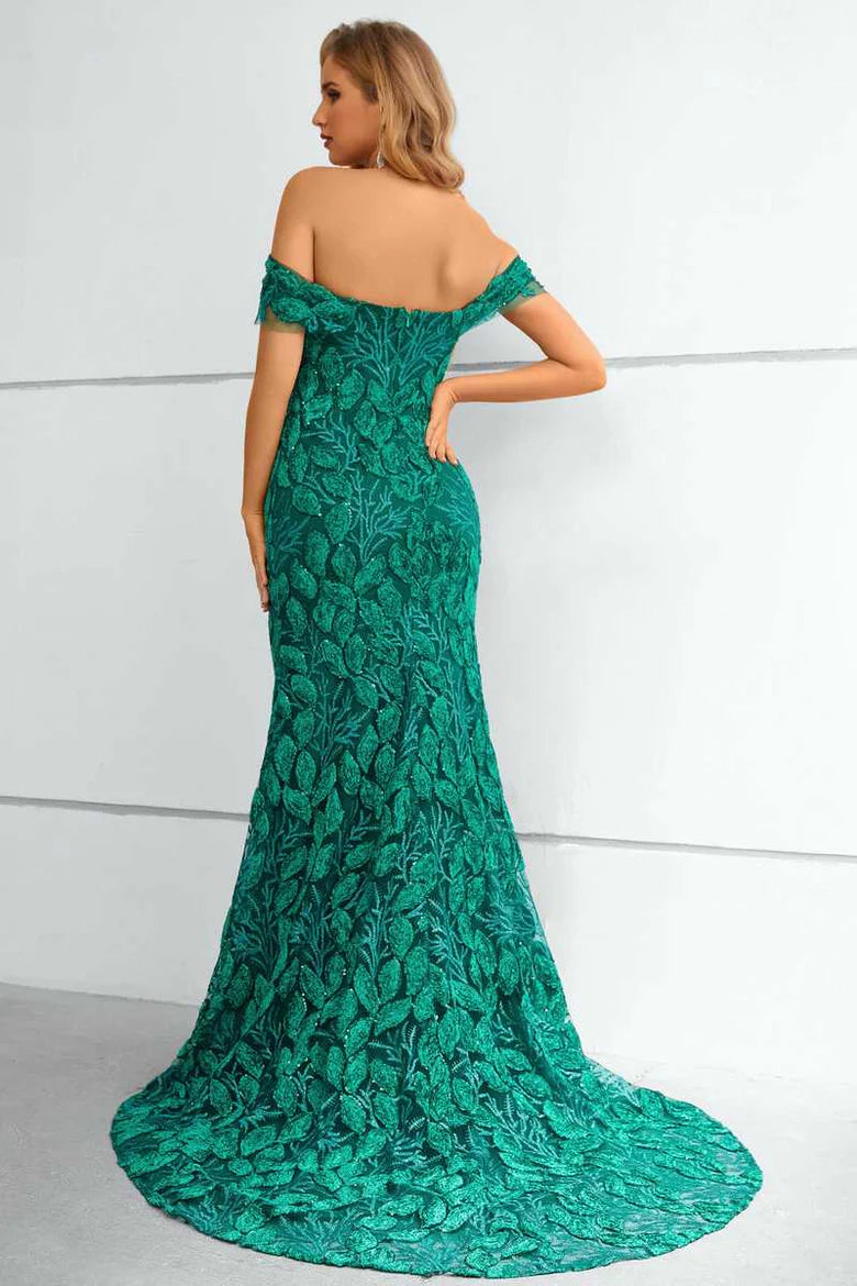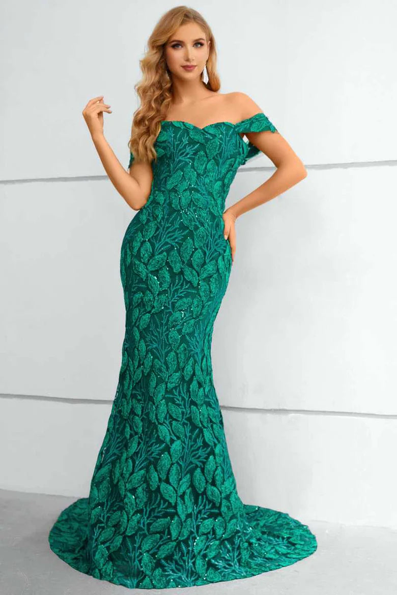Green Lace Off-the-Shoulder Mermaid Long Formal Gown