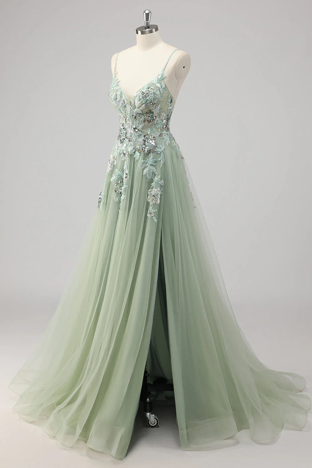Green Tulle A Line Sequins Appliqued Long Prom Dress With Slit
