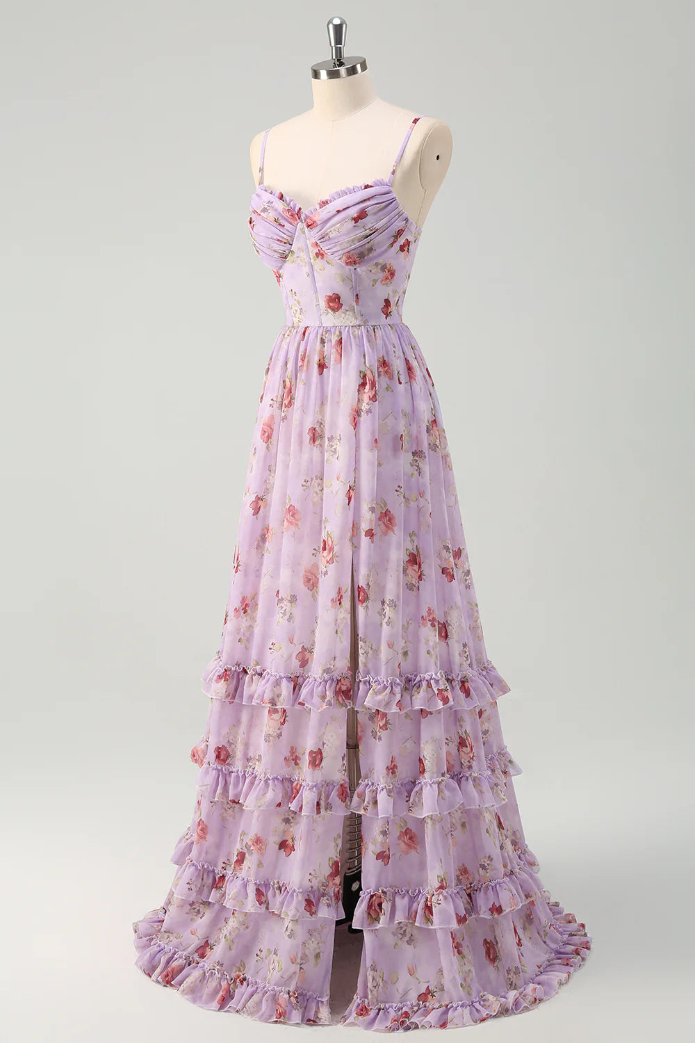 Grey Purple A Line Print Floral Lace Up Back Bridesmaid Dress with Slit