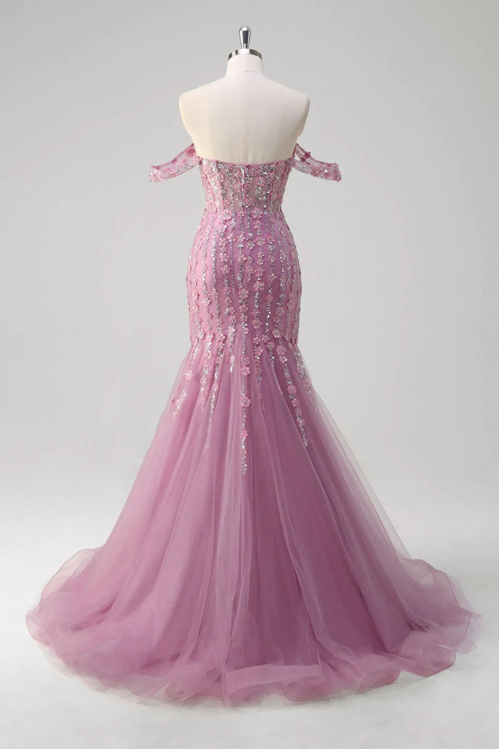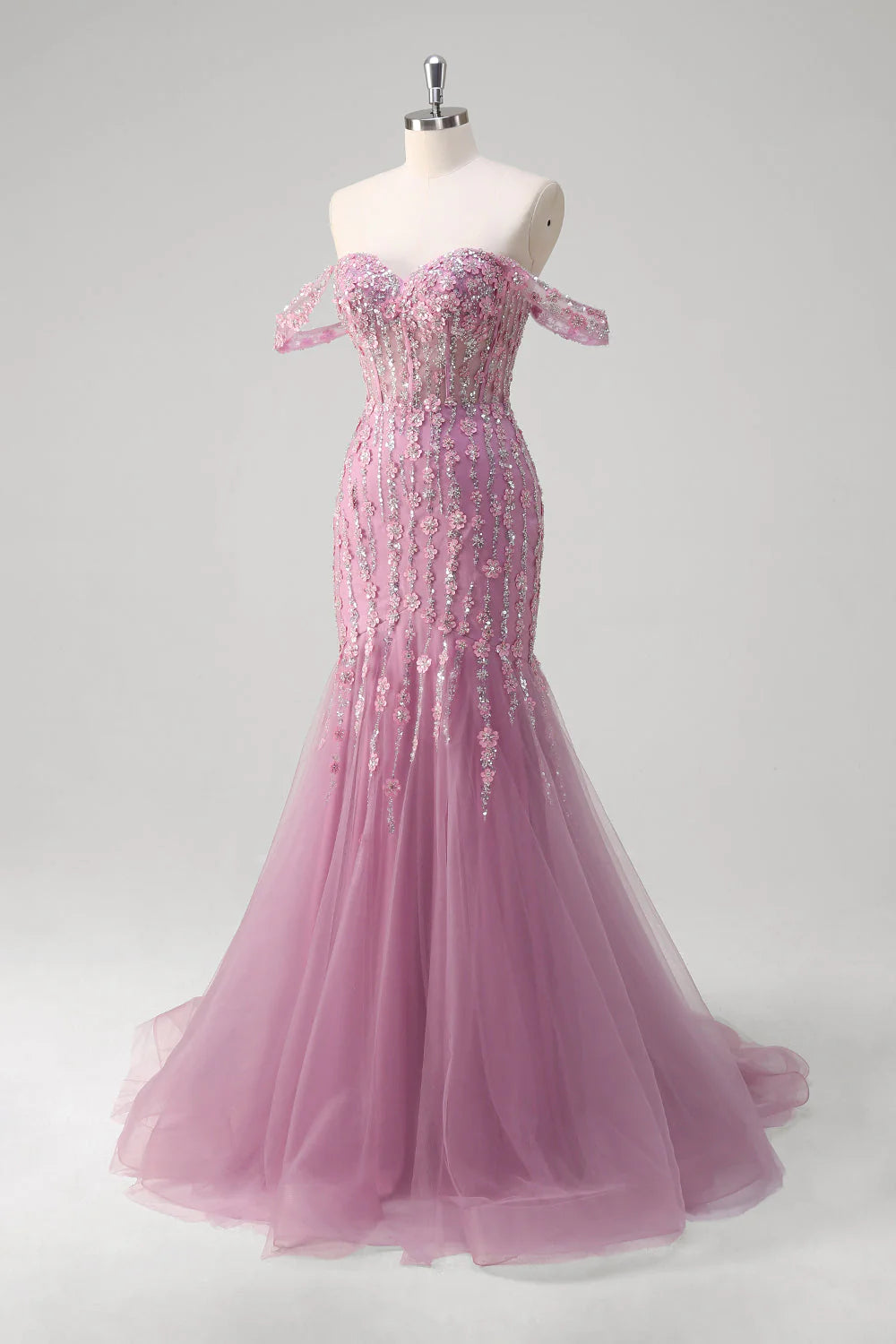 Grey purple mermaid off shoulder tight corset sheer dress with appliqu é