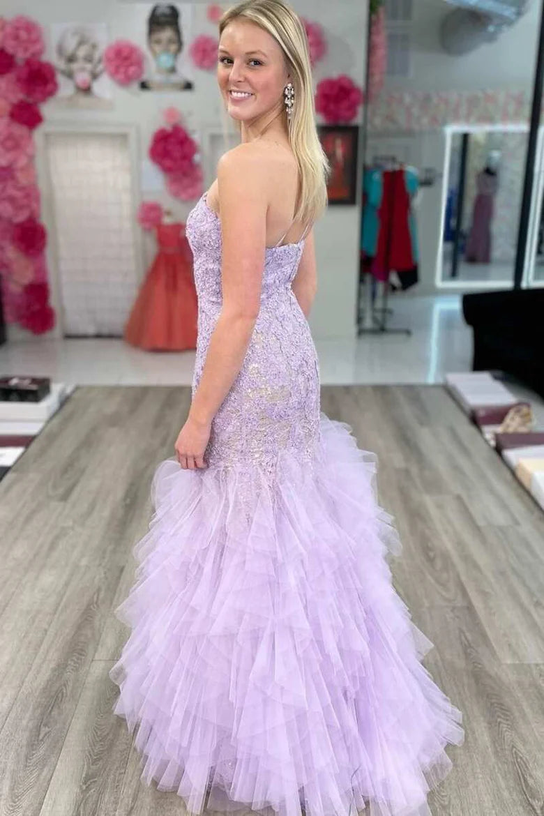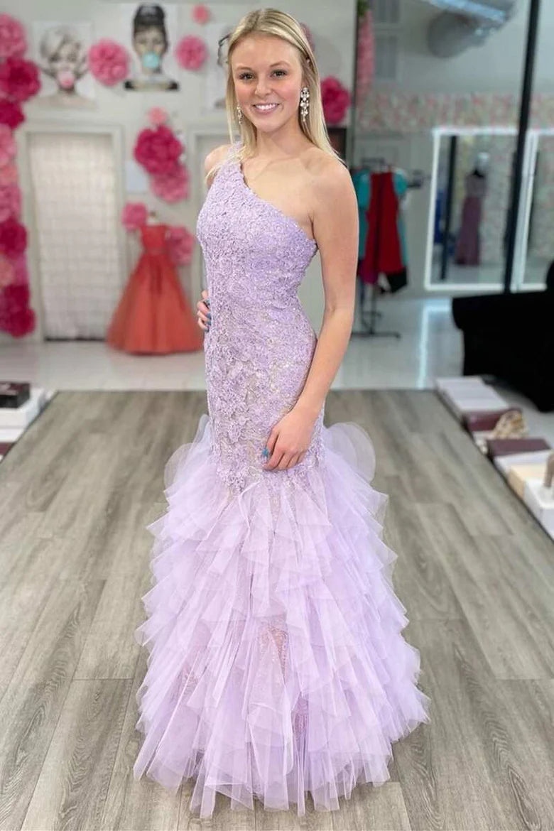 Lavender Lace One-Shoulder Tiered Trumpet Long Prom Gown