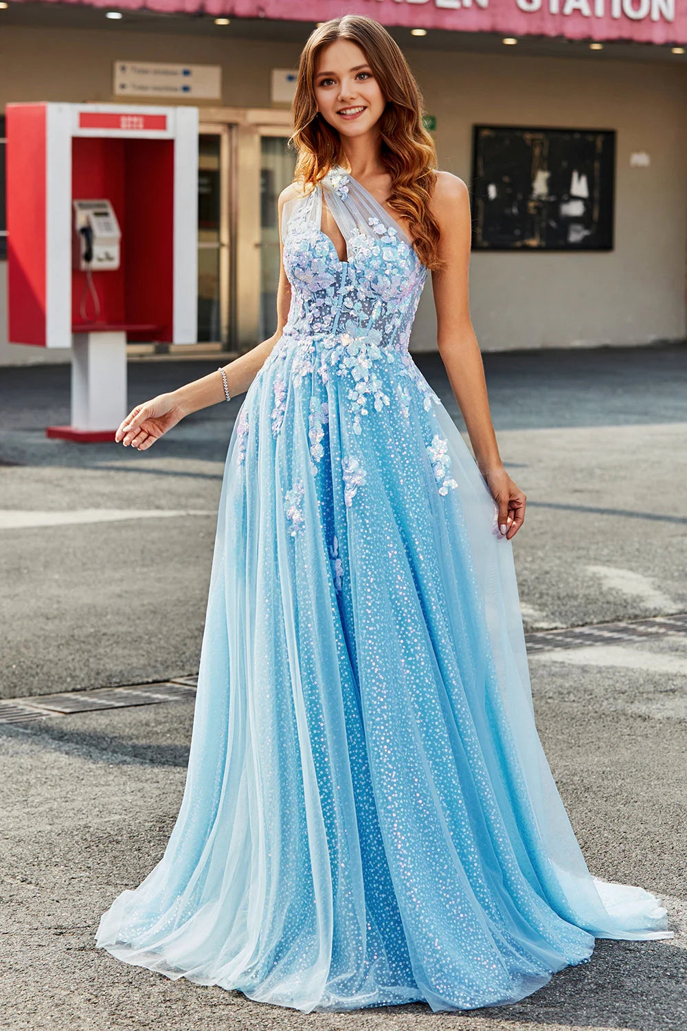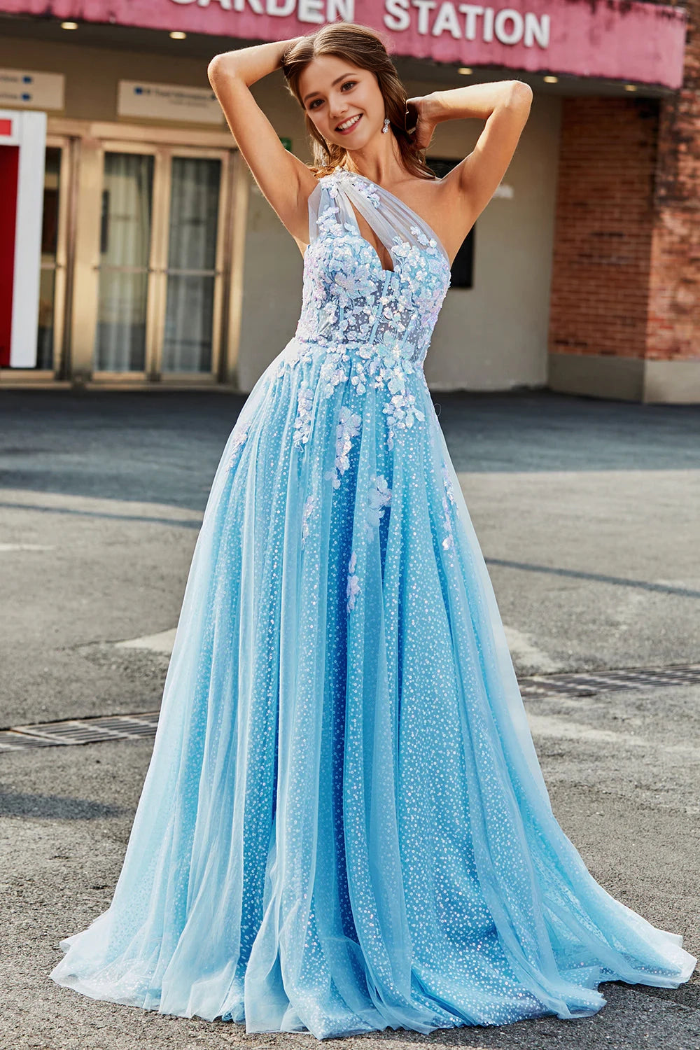 Light Blue A Line One Shoulder Long Tulle Prom Dress With Appliques