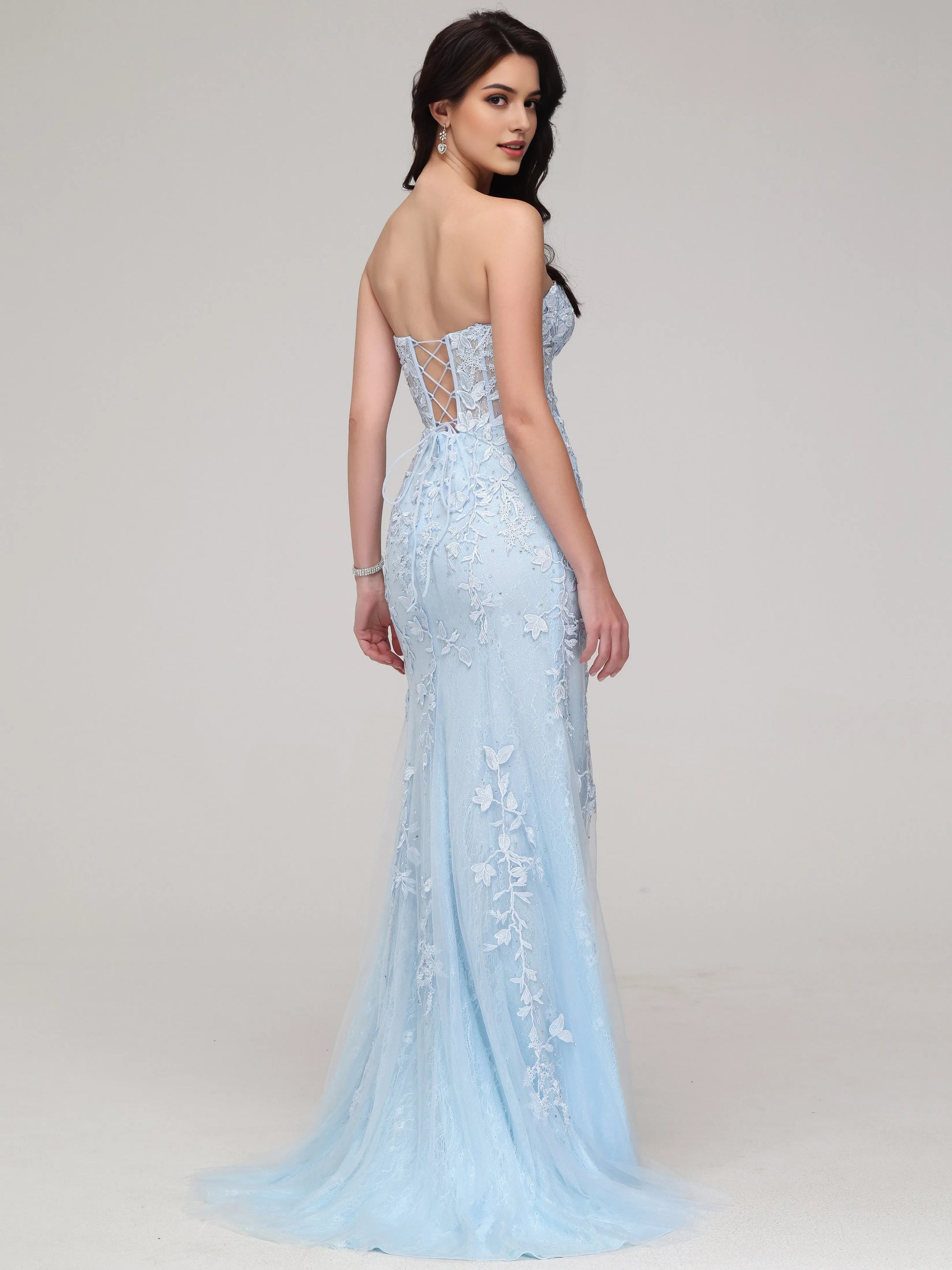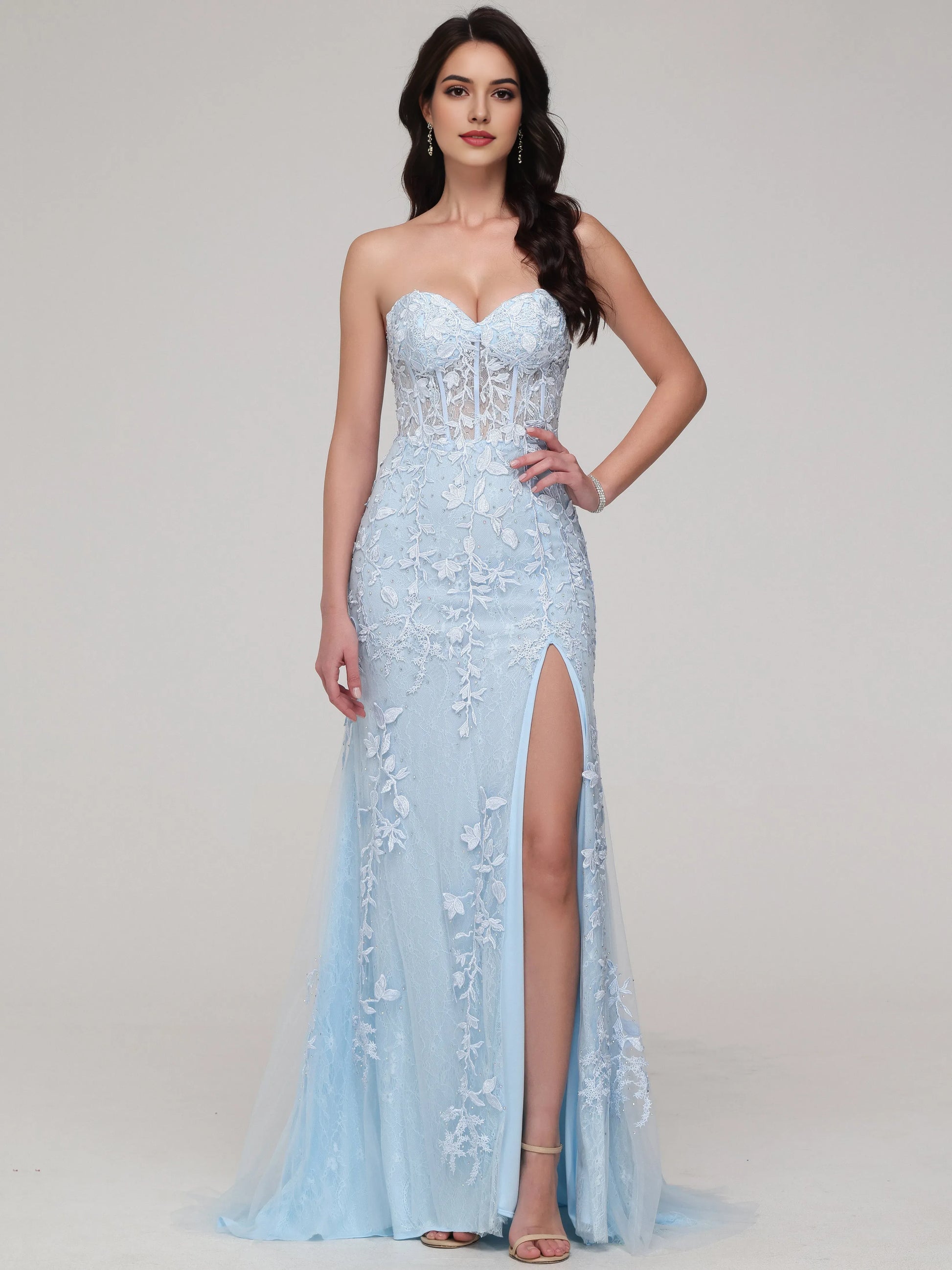 Light Blue Strapless Mermaid Sweetheart Lace Appliques Prom Dress with Slit with Floral Sheer Corset Detailing and High Side Slit