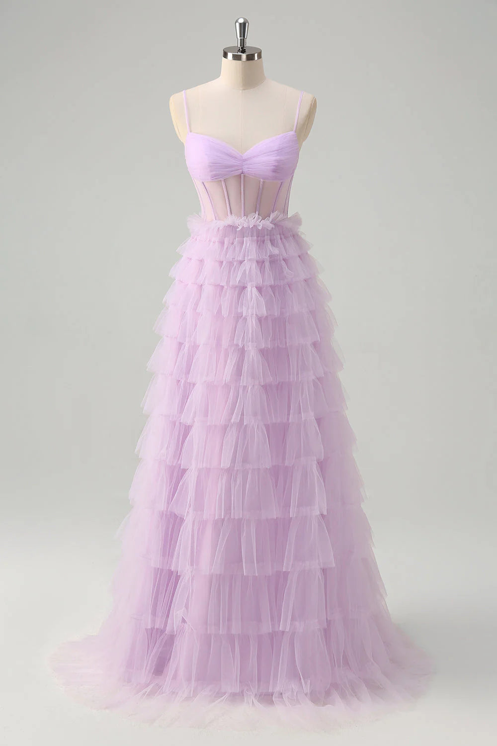 Light purple A-line thin suspender transparent tight corset layered long ball skirt with ruffles
