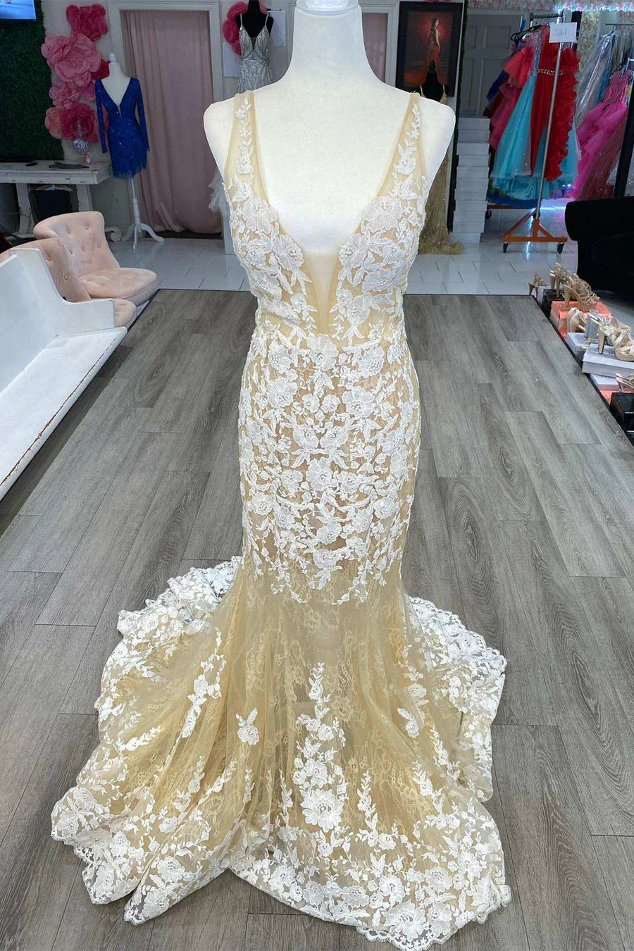 Light Yellow Floral Lace Plunge V Trumpet Long Prom Gown