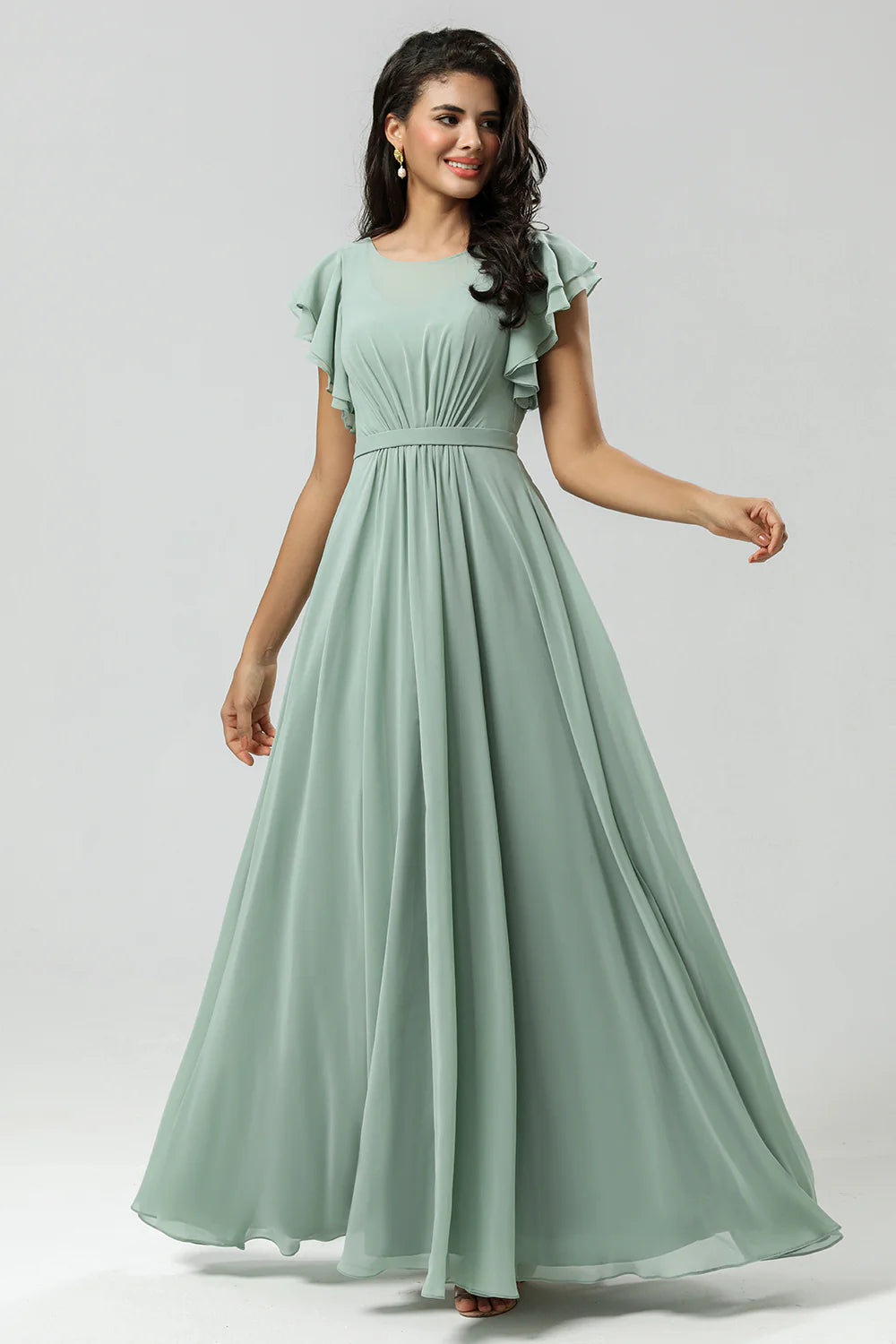 Matcha A Line Round Neck Ruched Floor Length Chiffon Bridesmaid Dress