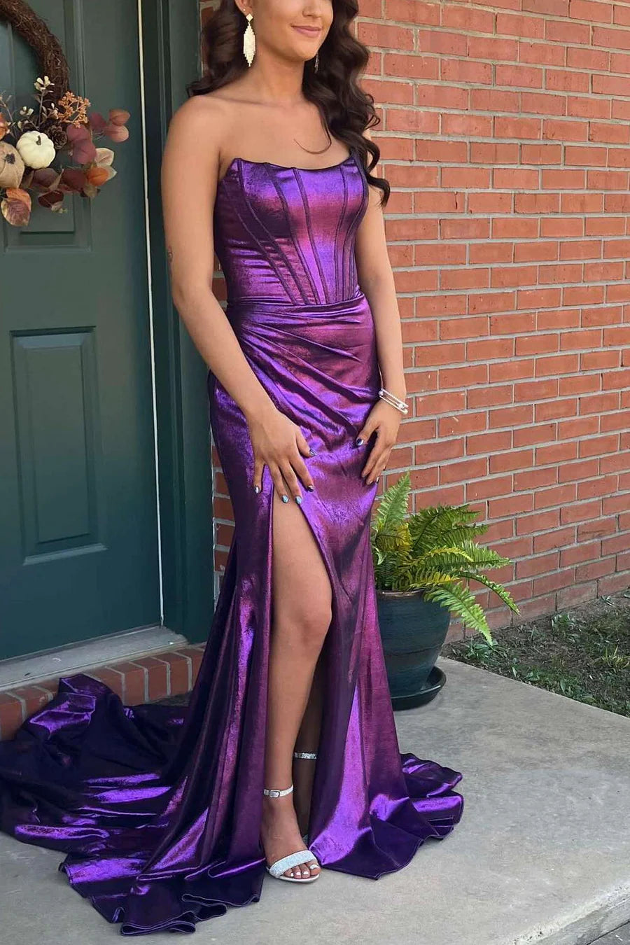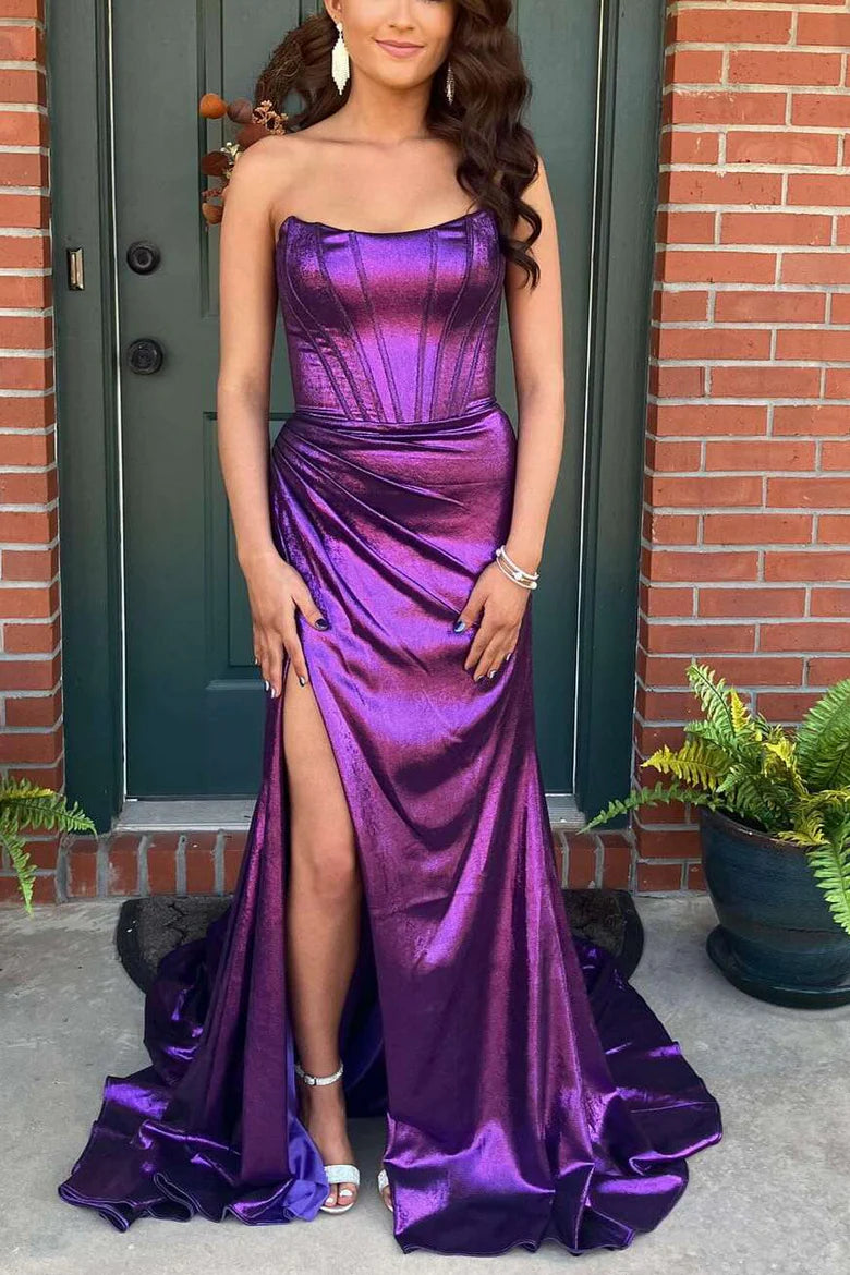 Mermaid Strapless Metallic Pleated Scoop Purple Long Prom Dress with Slit