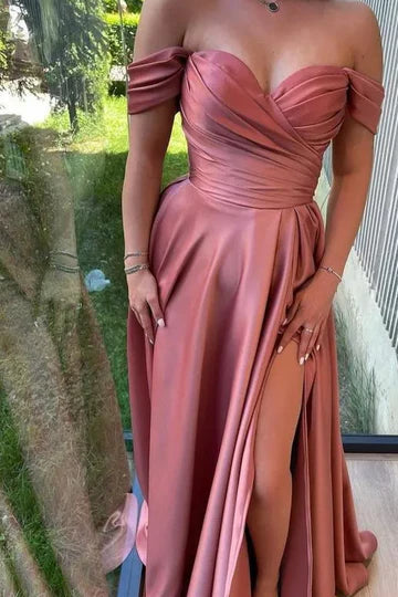 Off-Shoulder A-Line Satin Pleated Long Formal Prom Dress with Slit