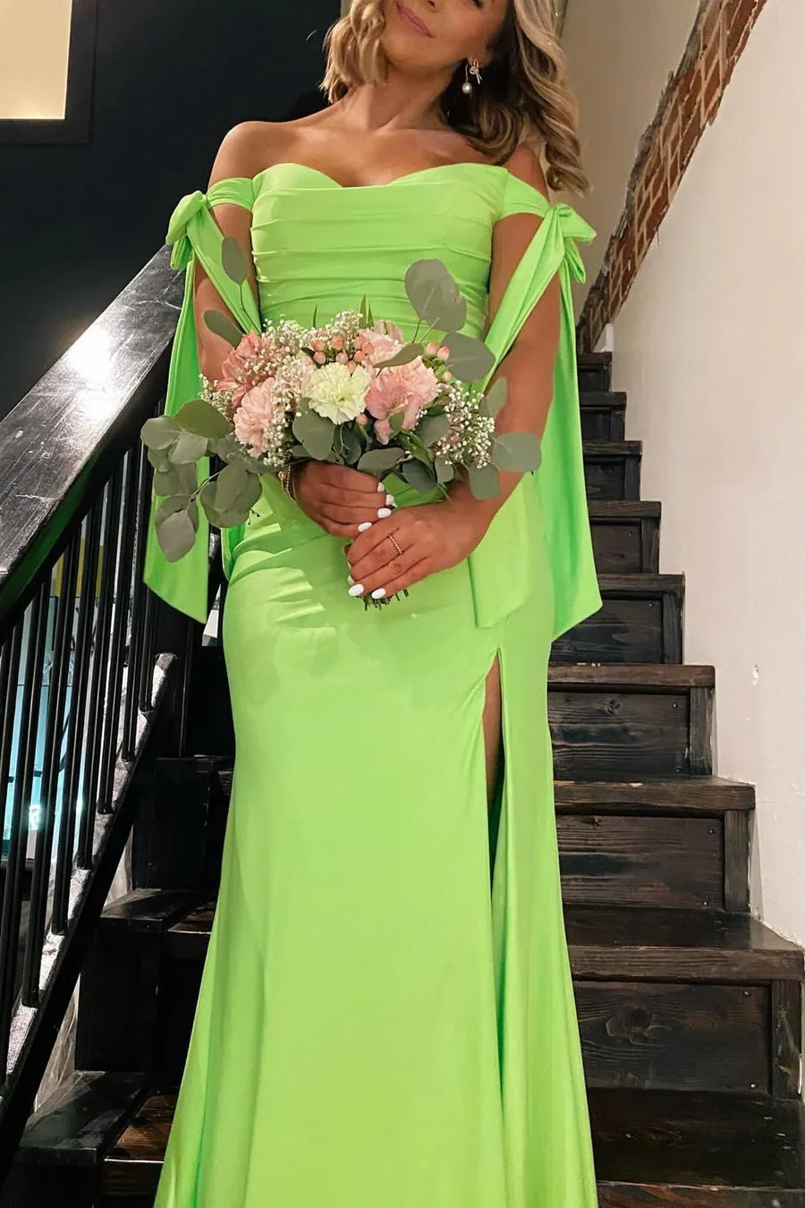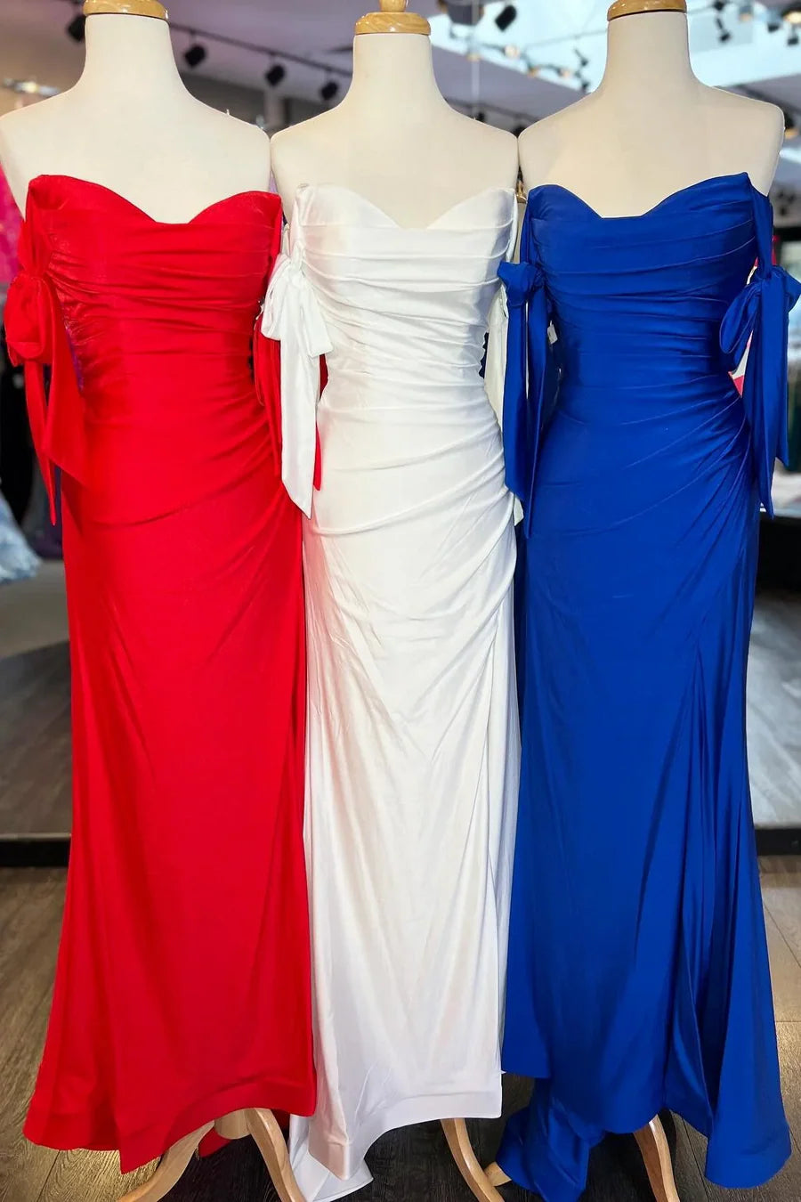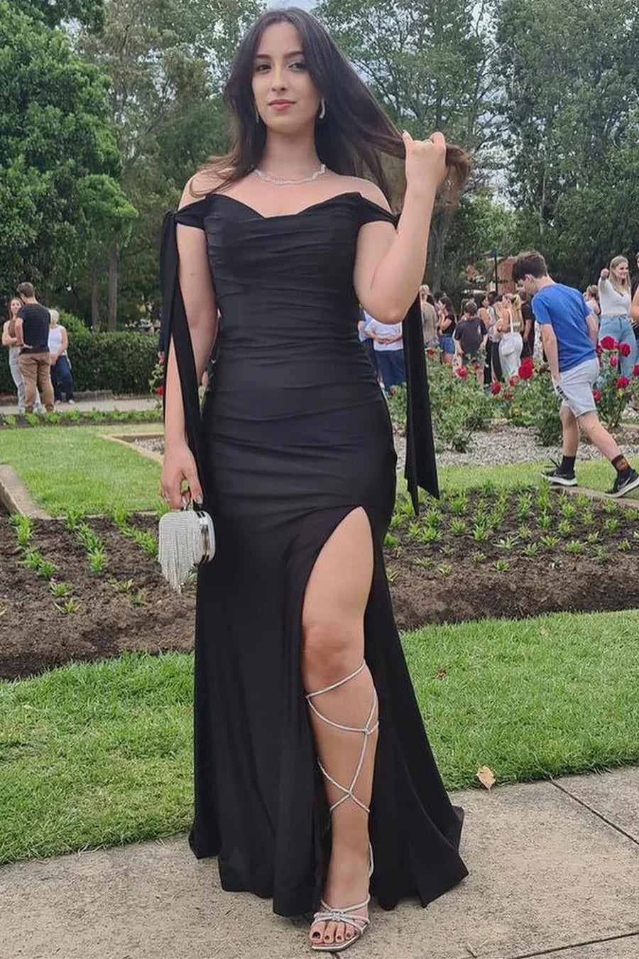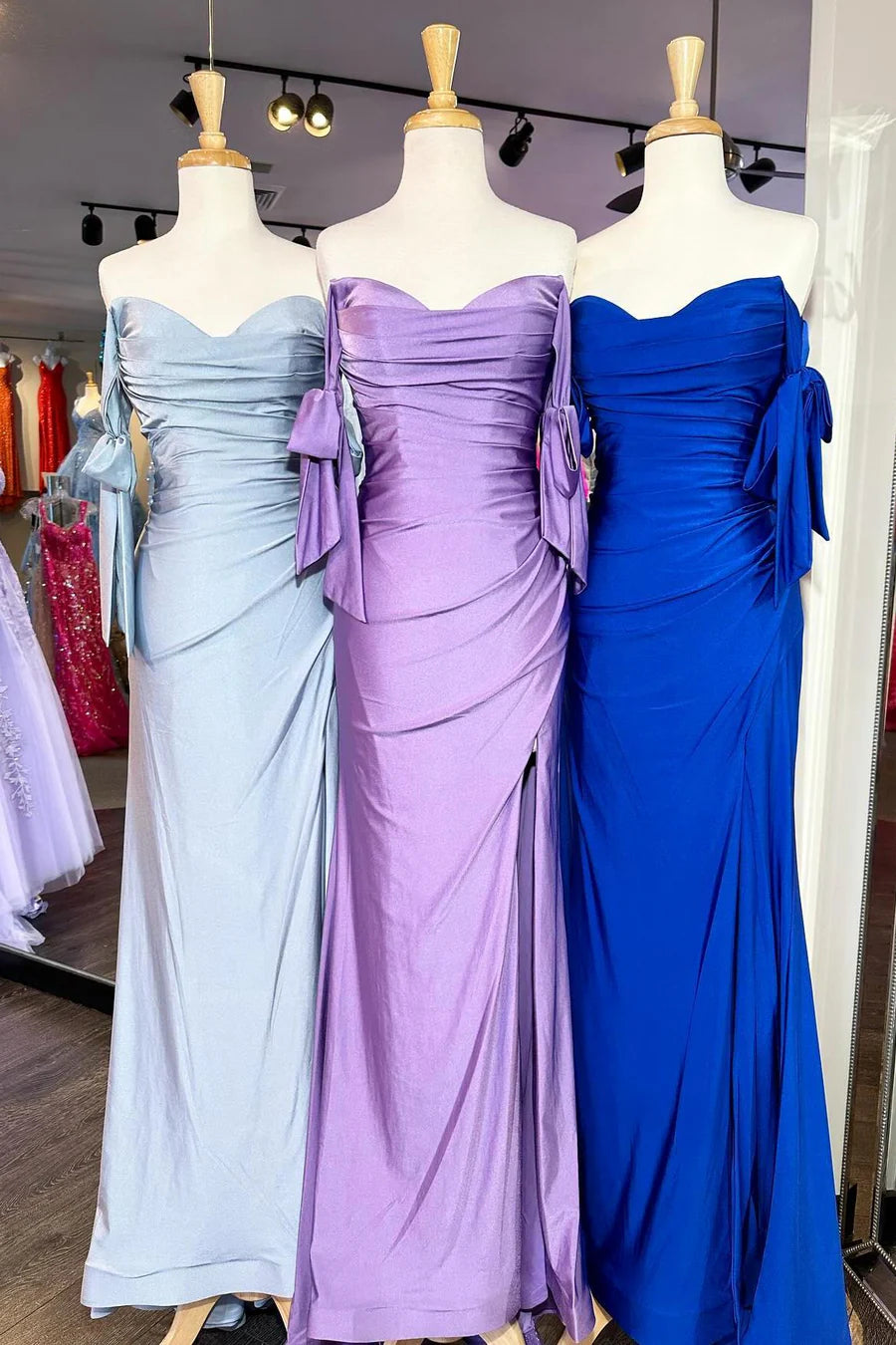 Off-Shoulder Sweetheart Pleated Satin Long Prom Formal Dress with Slit