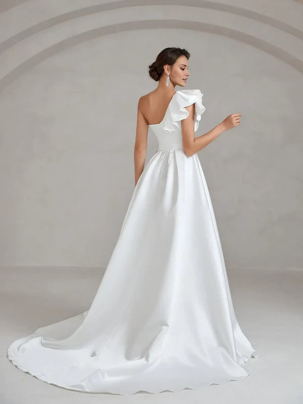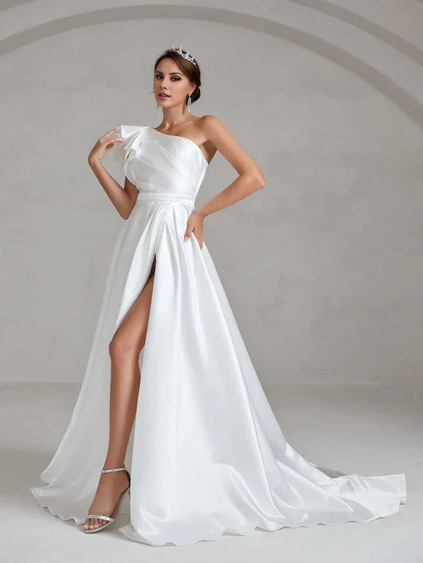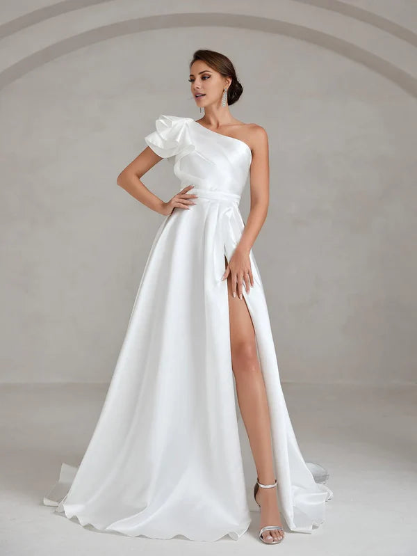 One shoulder satin side slit with ruffle edge and floor length wedding dress