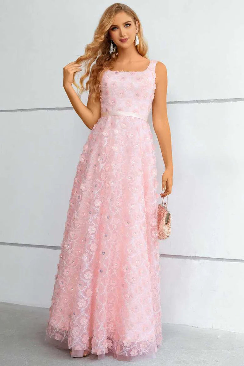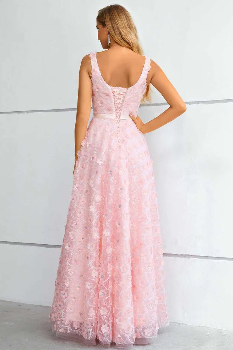 Pink 3D Floral Lace Square Neck A-Line Prom Dress