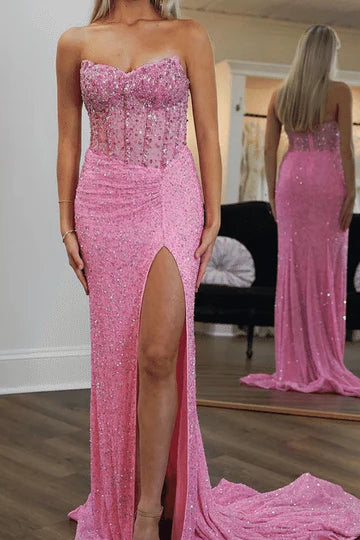 Pink Mermaid Beads Strapless High Slit Long Prom Formal Dress