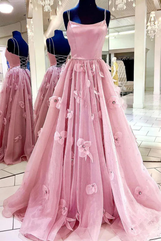 Pink Spaghetti Straps A-Line 3D Floral Tulle Long Formal Prom Dress
