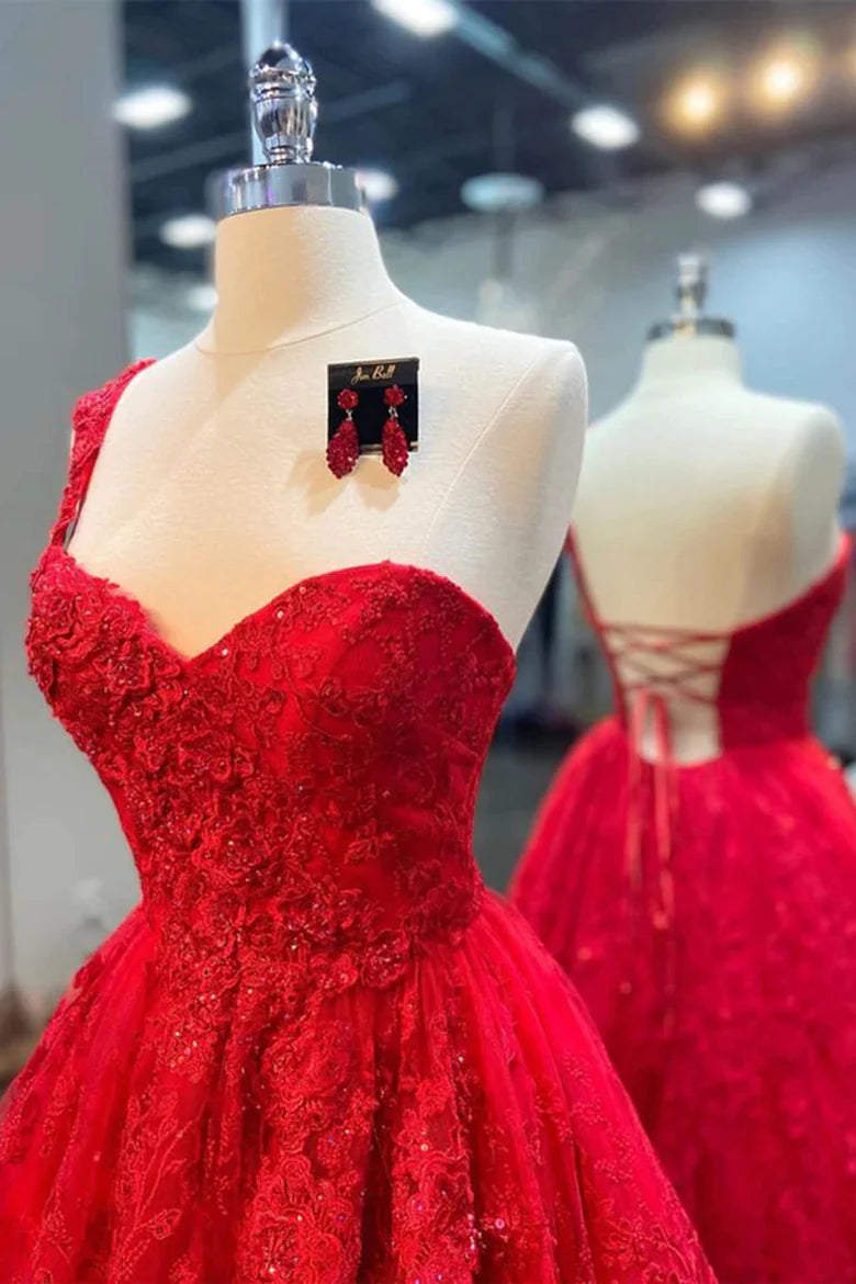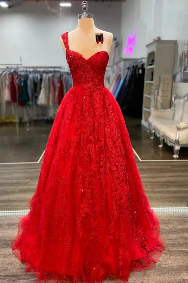 Red One Shoulder A-Line Lace Appliques Empire-Waist Prom Dress