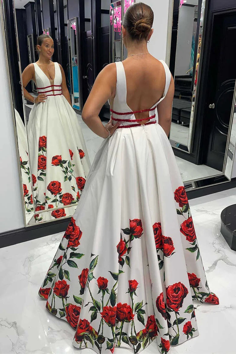 Rose Print Plunge V Backless A-Line Long Formal Dress