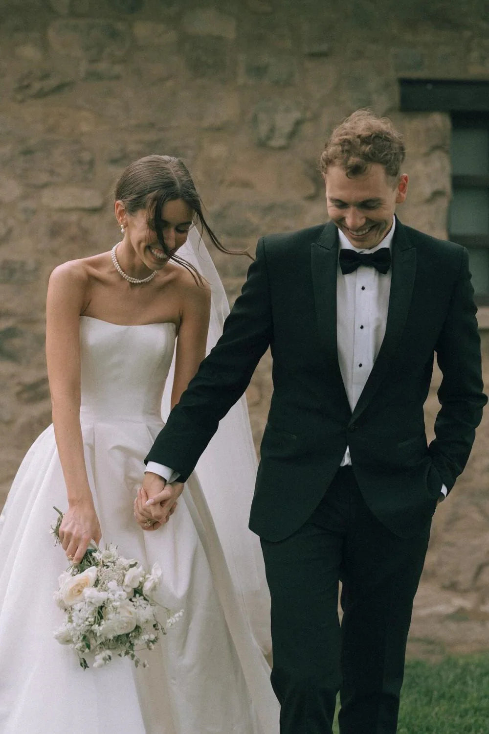 Simple A Line Strapless White Satin Wedding Dress with Sweep Train
