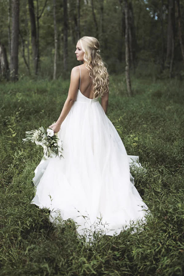 Simple Spaghetti Straps Tulle Backless V Neck Wedding Dresses