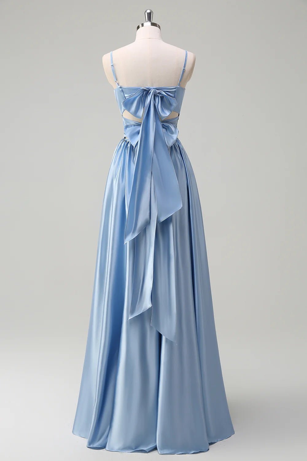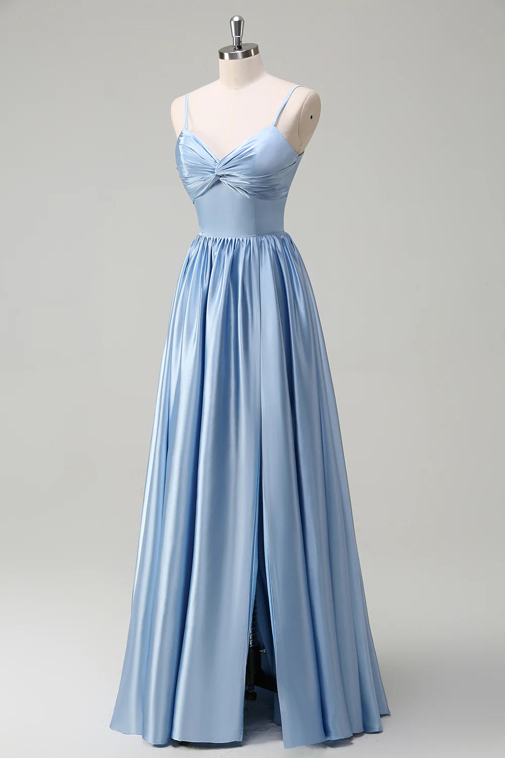Sky Blue A Line Spaghetti Straps Ruched Long Bridesmaid Dress with Slit