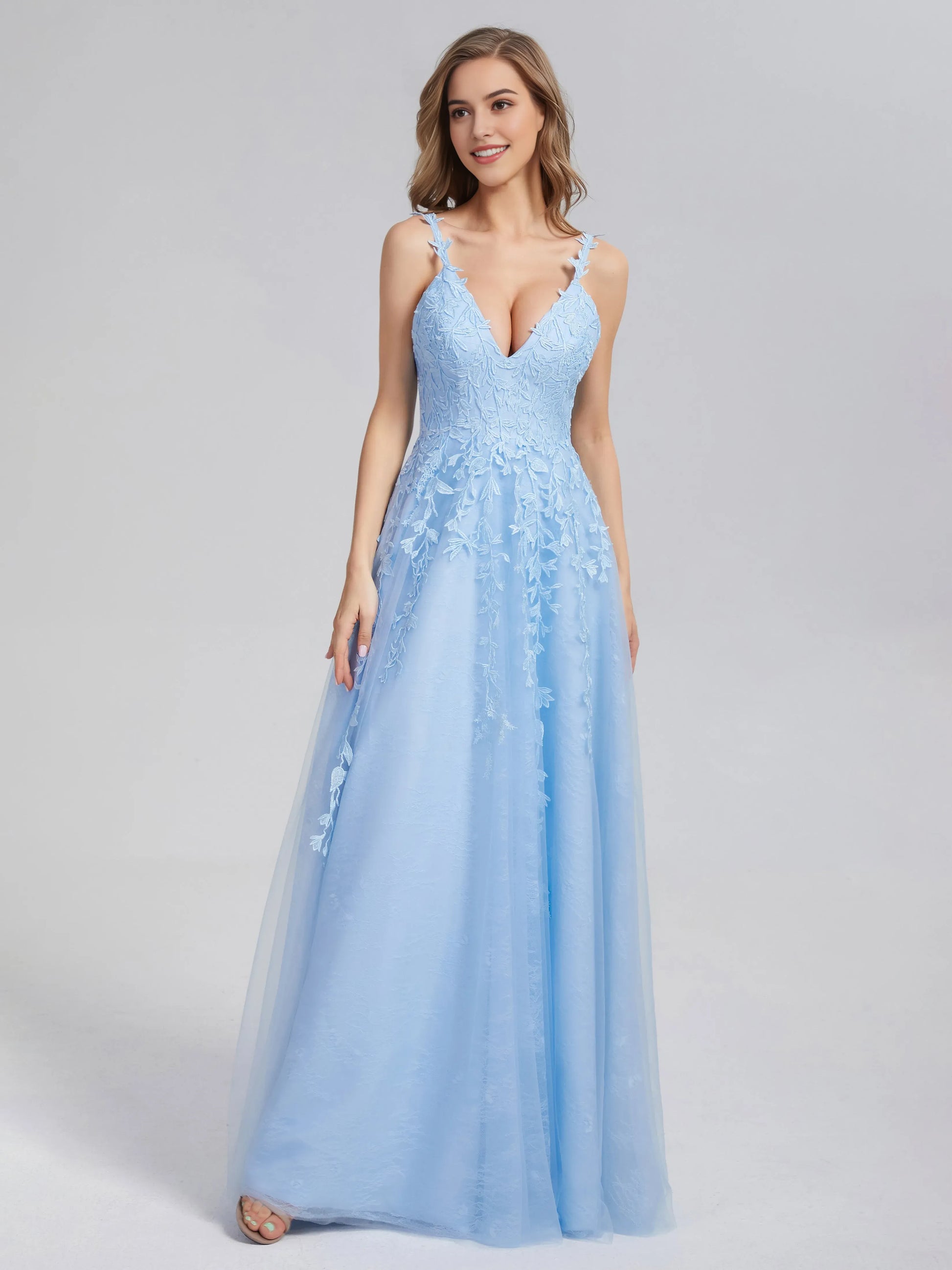 Sky Blue Tulle V-neck Backless Appliques Prom Dress with Plunging Floral Lace and A - Line Silhouette