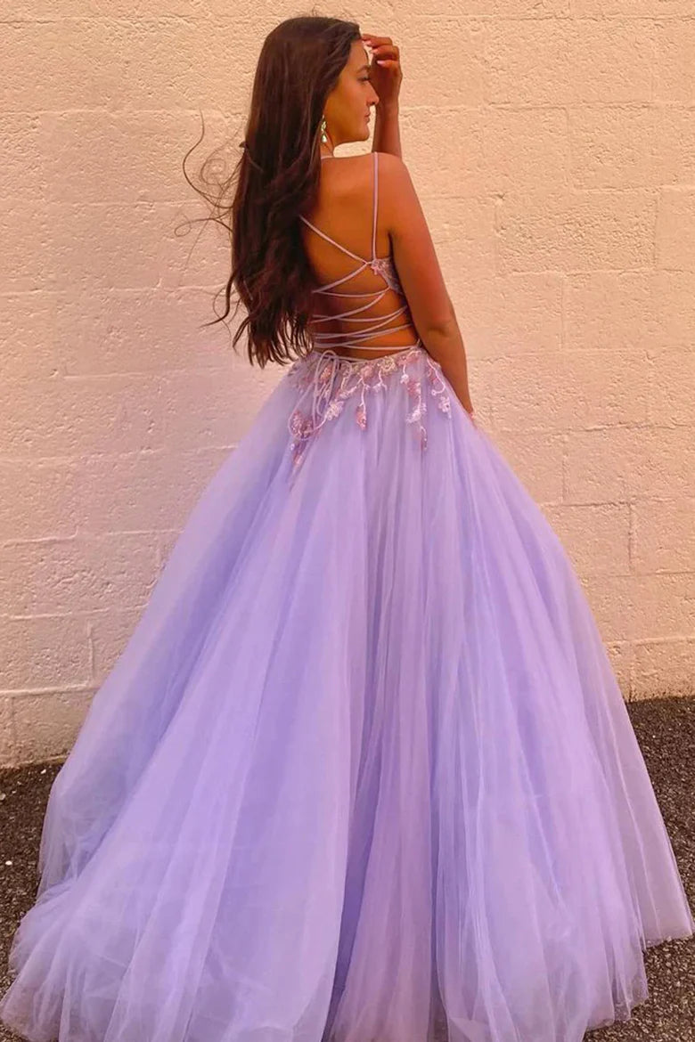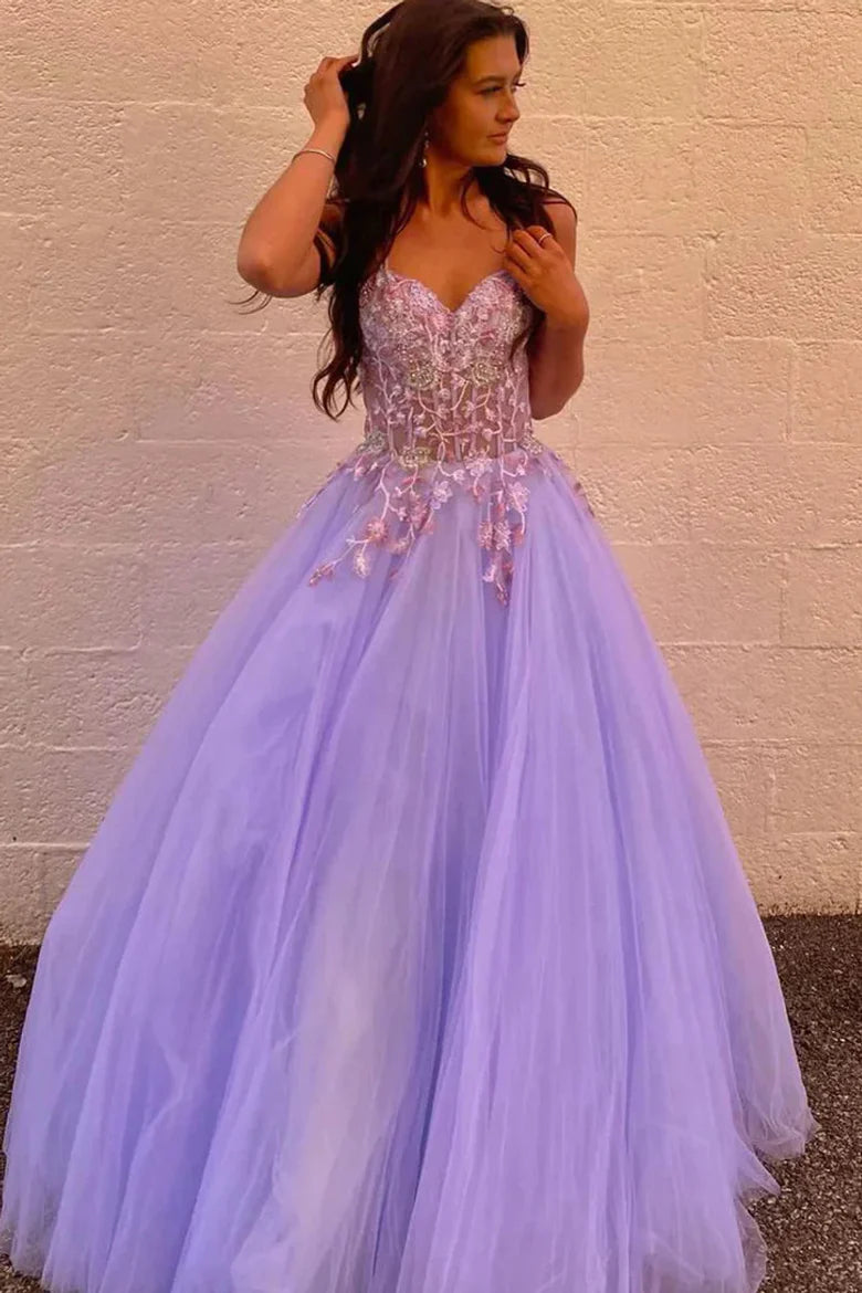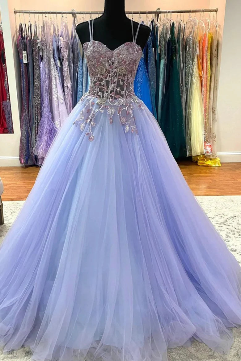Spaghetti Straps Lace Appliques Sleeveless Sweetheart Tulle Prom Dress