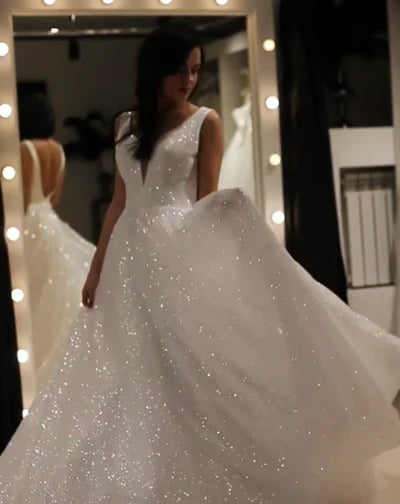 Sparkly Bridal Gowns V Neck Backless Wedding Dresses with Sequins