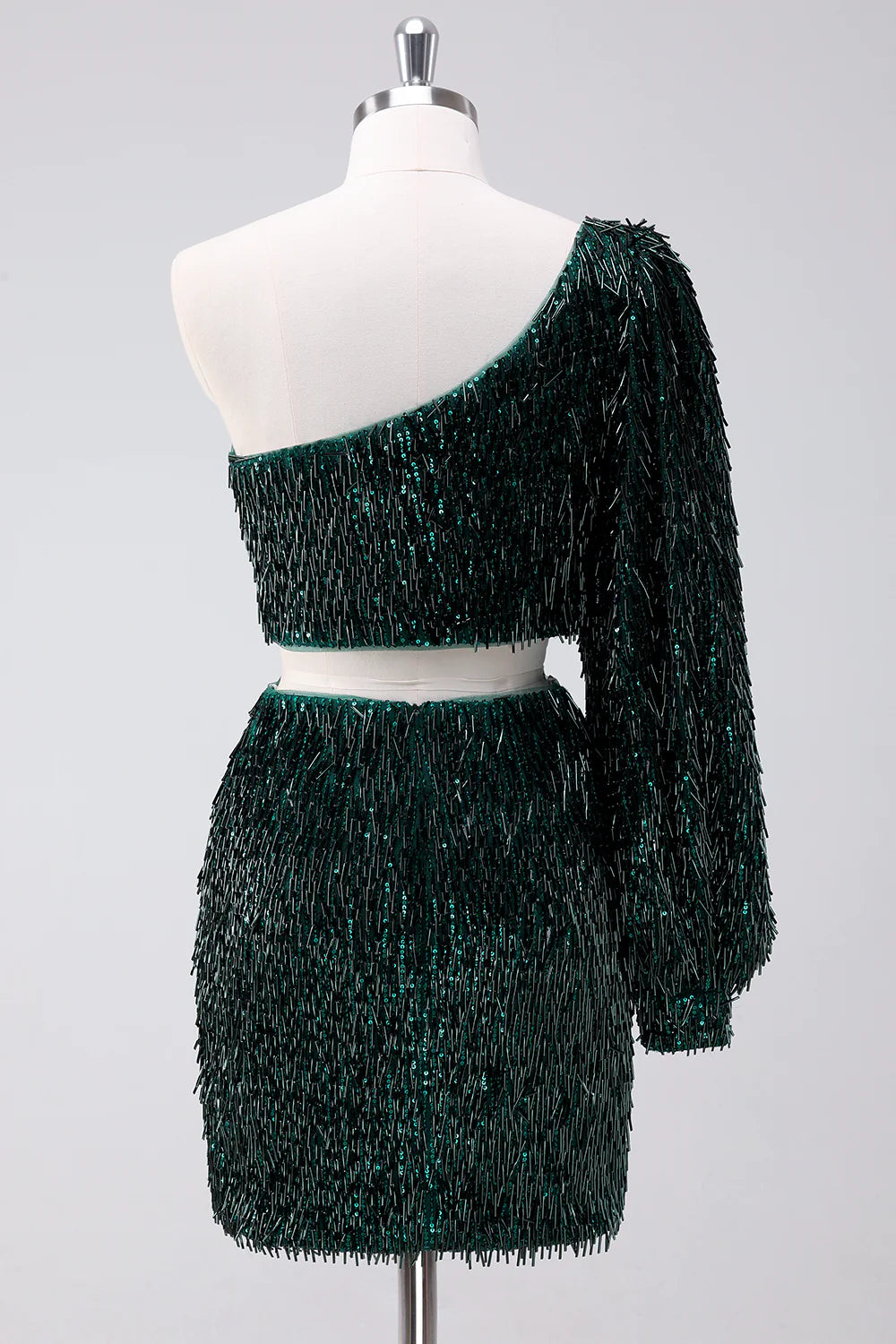 Sparkly Fringed Dark Green One Shoulder Short Homecoming Dress