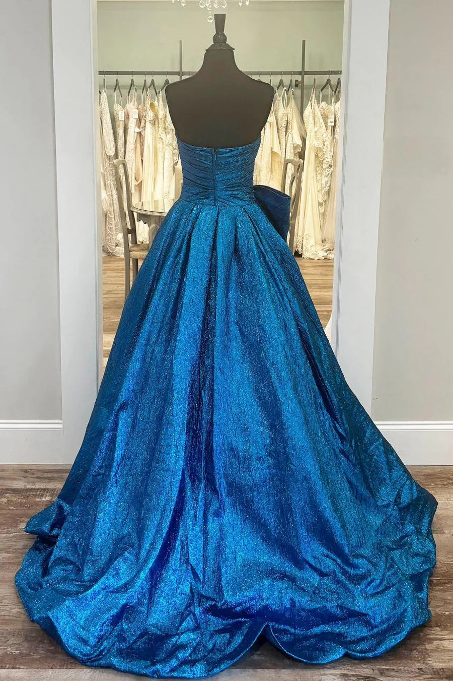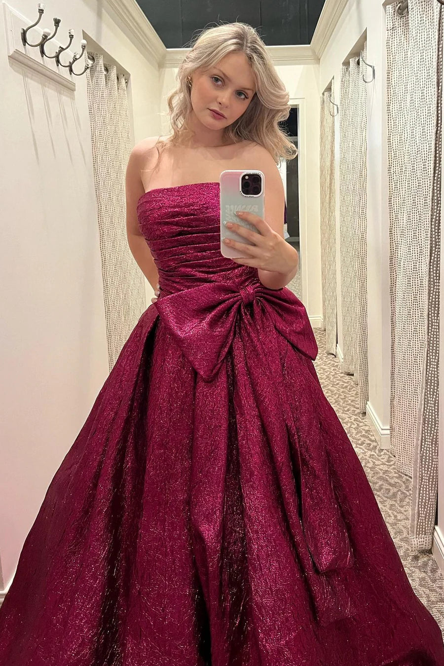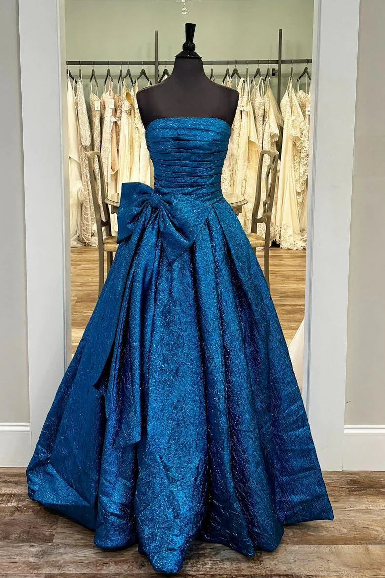 Strapless A-Line Pleated Scoop Sleeveless Long Prom Dress with Bow